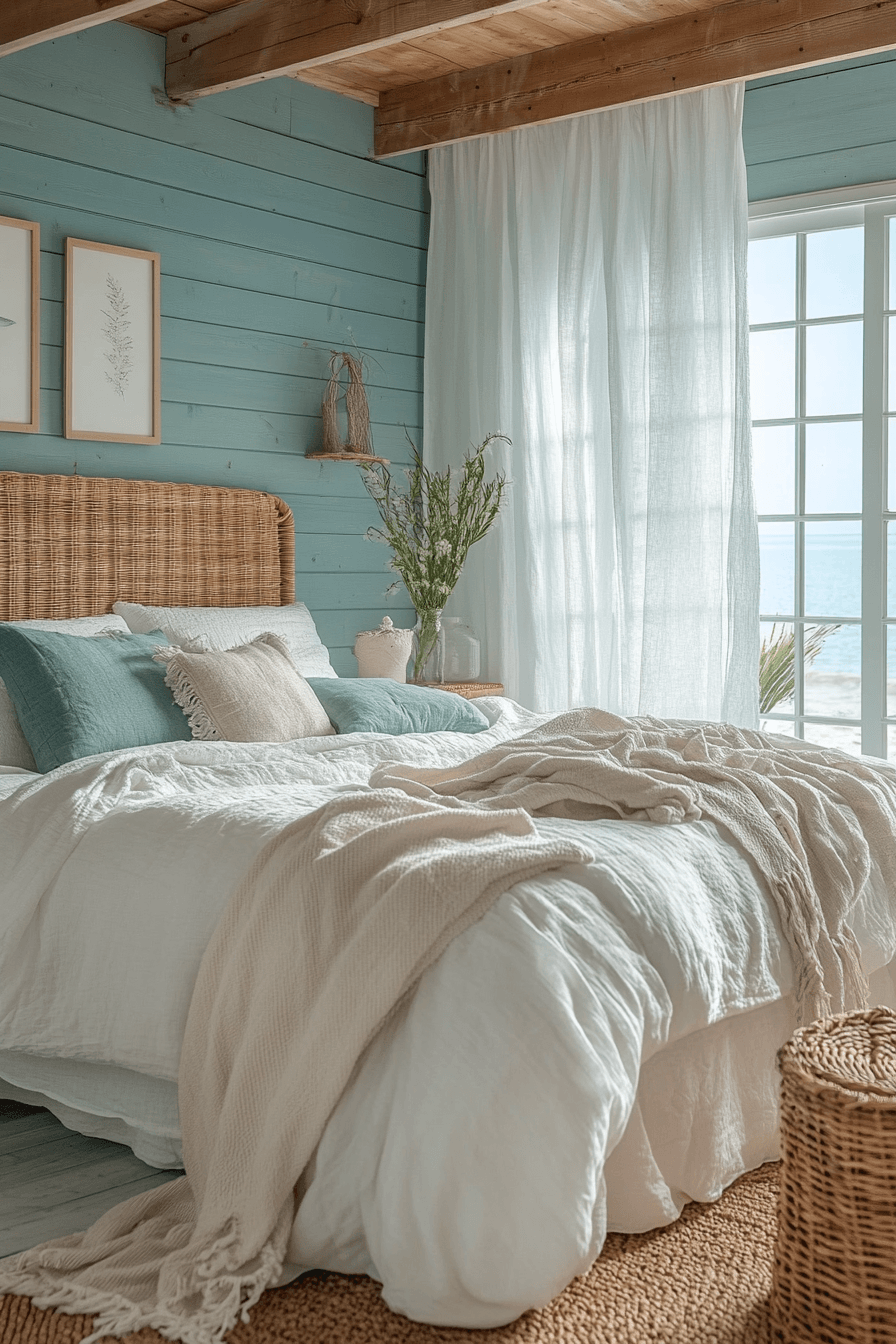 Beach-inspired tones bring a relaxed energy to breezy natural wood bedroom ideas influenced by coastal living. Sun-washed wood finishes pair beautifully with striped linens and woven accents. Soft blues, warm whites, and sandy neutrals create a calm seaside palette. Decor remains minimal to keep the room feeling open and peaceful. The result is refreshing, airy, and vacation-like. Click to explore coastal-inspired wood bedrooms.