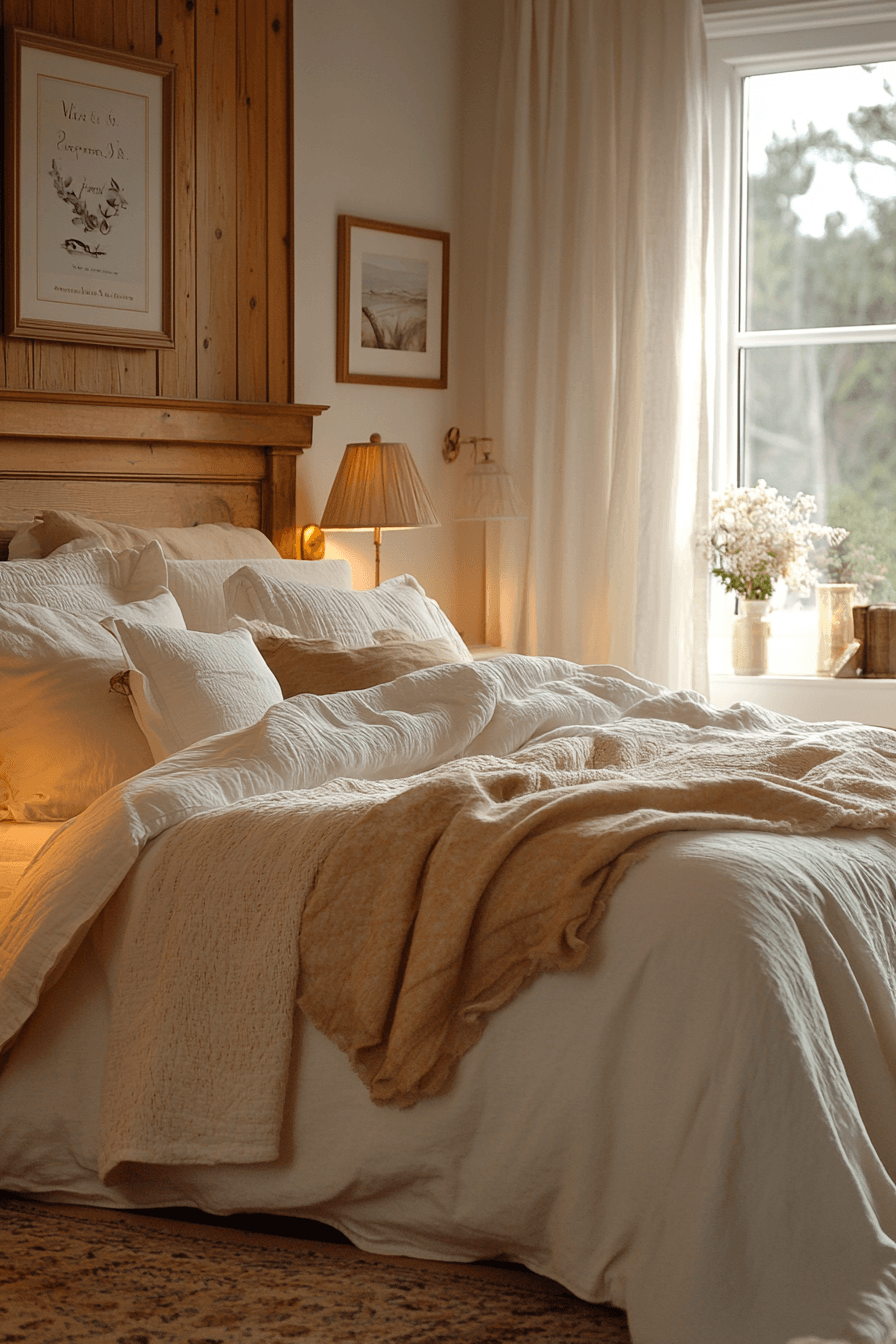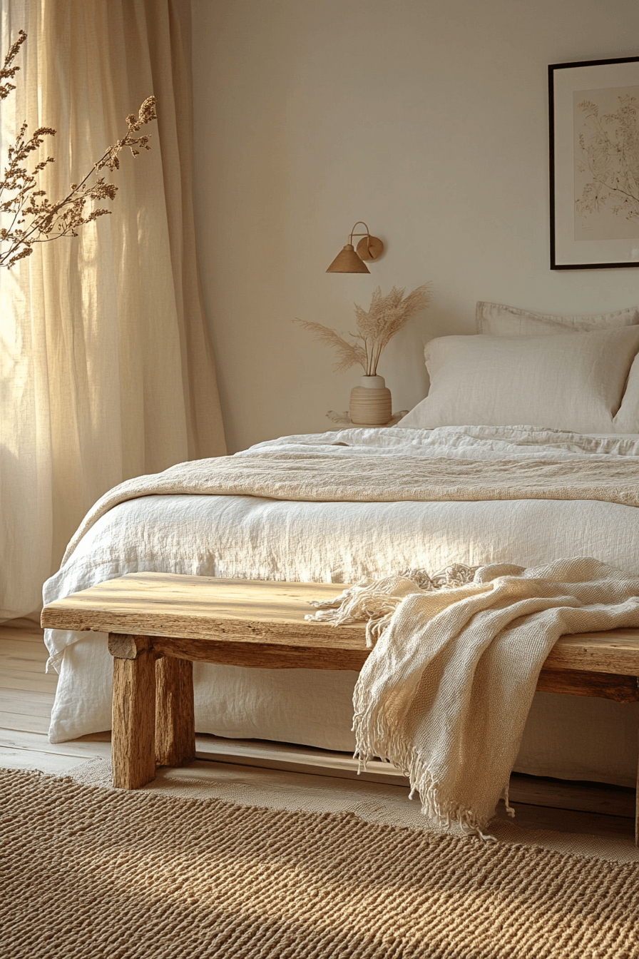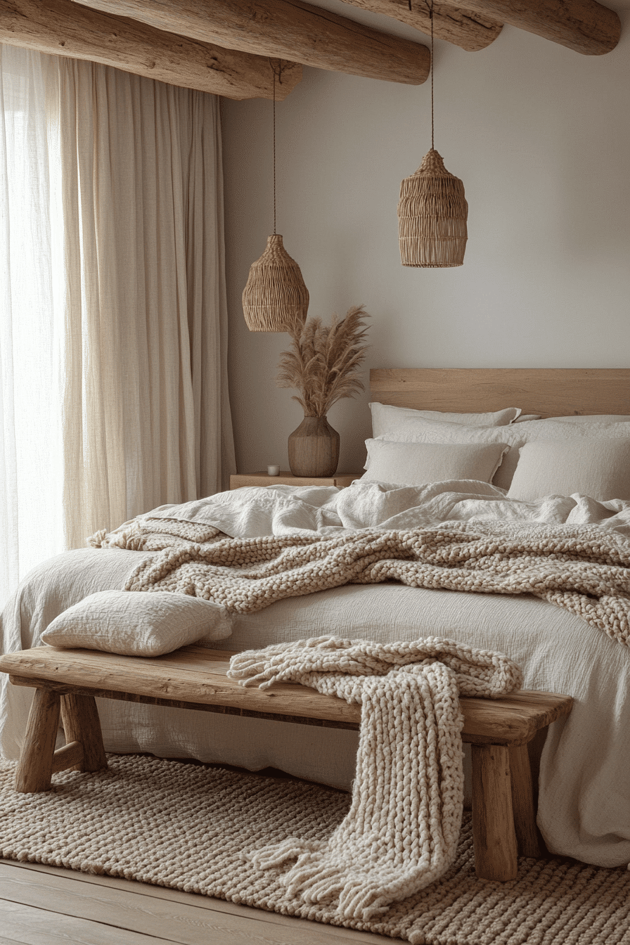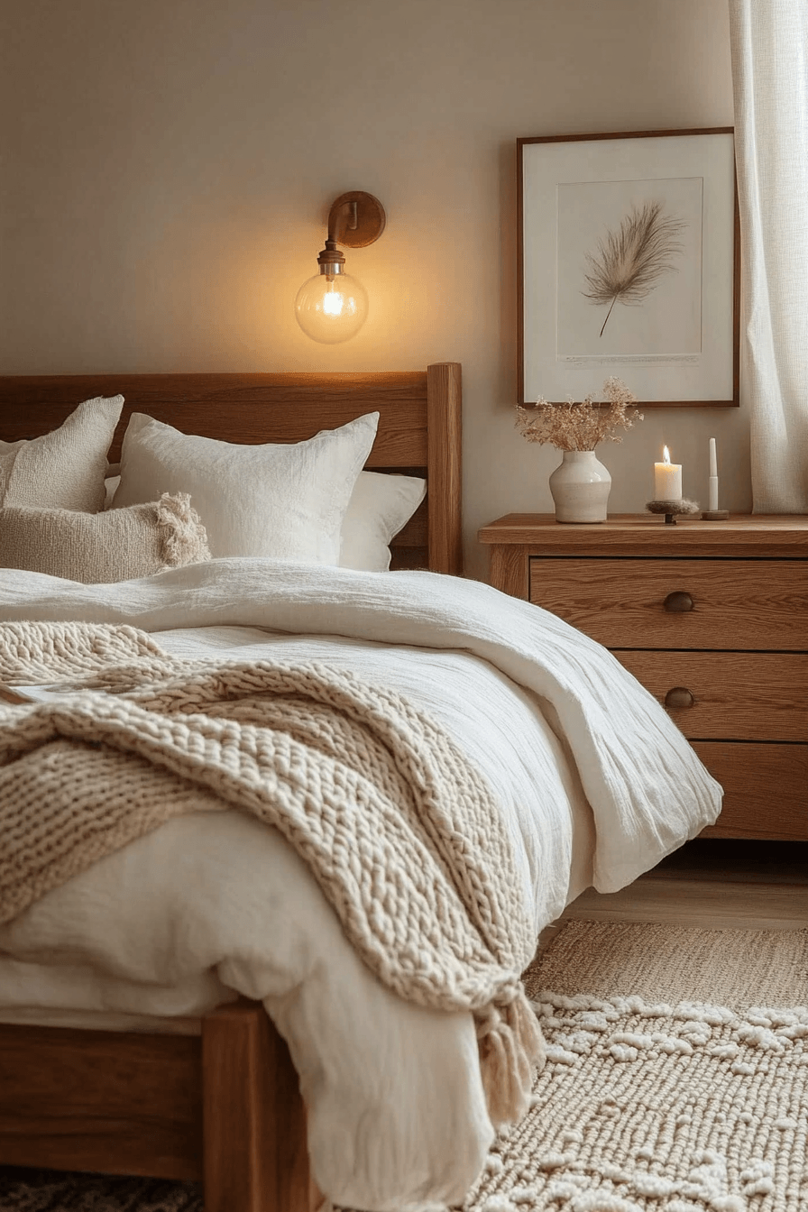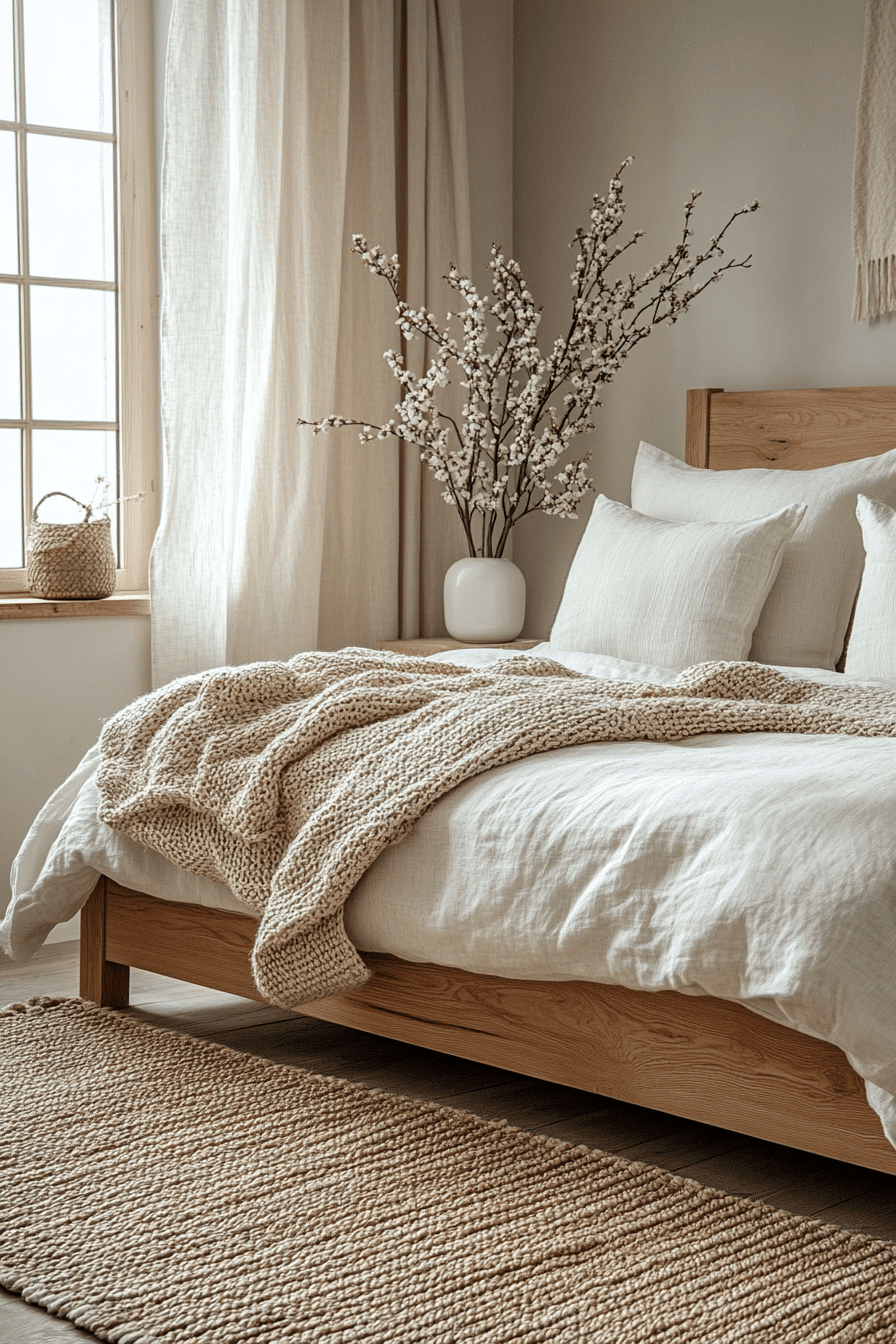 Soft textiles layered over wood create cozy and inviting natural wood bedroom ideas that feel warm and comforting. A light wood foundation pairs beautifully with linen, cotton, and boucle fabrics. Layered rugs and plush bedding enhance the sense of softness. Woven accents add visual interest while keeping the palette neutral. The wood acts as a calm backdrop for comforting textures. Tap to experience texture-driven bedroom design.