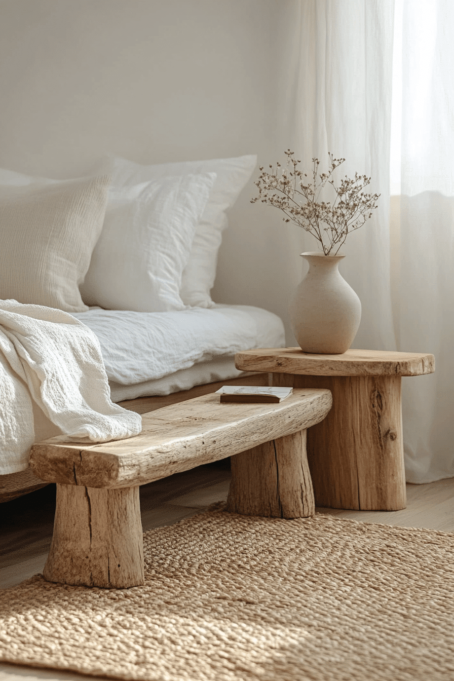 Flowing shapes and natural textures define these natural wood bedroom ideas, where furniture with curved edges and handcrafted details takes center stage. Pieces made from raw-edge wood or sculpted timber add visual interest and warmth. Soft layers like wool blankets, sheer curtains, and neutral bedding keep the atmosphere calm and inviting. By keeping decor simple, the beauty of the wood becomes the main focal point. The result is a bedroom that feels warm, modern, and connected to nature. Tap here to see how organic design transforms a bedroom.