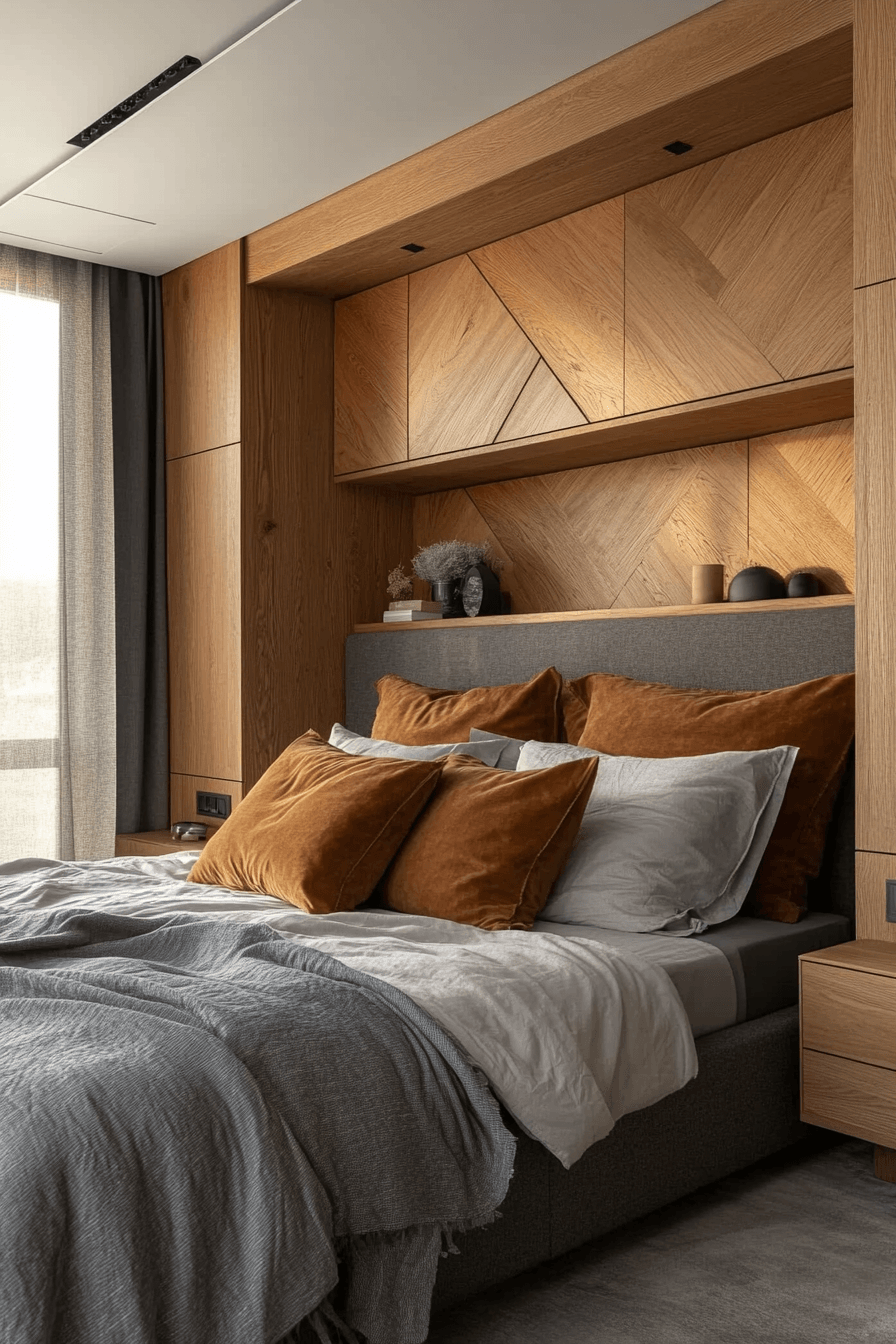 Strong geometry and simple structure shape these elegant natural wood bedroom ideas that highlight architectural clarity. Rectangular furniture forms, straight edges, and subtle hardware create a clean aesthetic. Natural wood grain remains visible to preserve authenticity. Gentle contrasts through wall color or textiles add visual interest. The design feels refined and thoughtfully composed. Tap to discover bedrooms built on pure design principles.