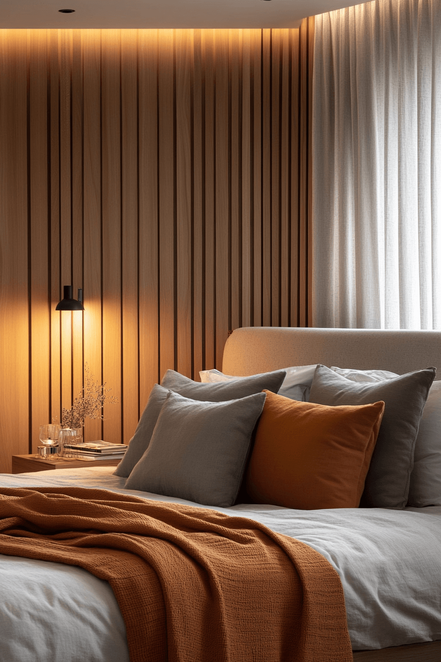 Architectural wood slats add depth and interest to stylish natural wood bedroom ideas. Vertical slat walls or headboards create subtle rhythm behind the bed. Minimal furniture and textured throws maintain the calm aesthetic. Natural light interacting with the slats enhances visual movement. Neutral tones keep the room peaceful and spa-like. Tap to see how wood slats transform modern bedrooms.