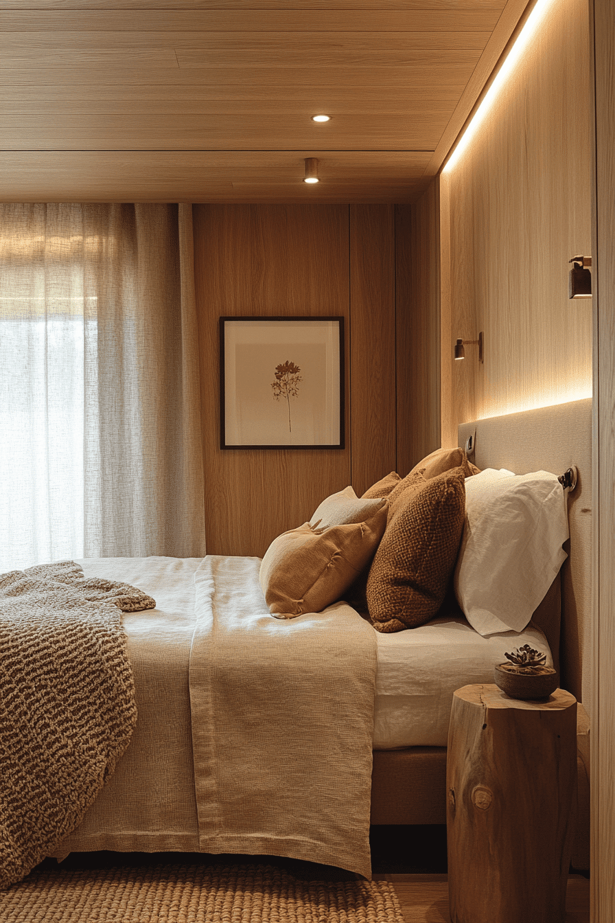 Rich materials paired with simple styling create luxurious natural wood bedroom ideas without excess decoration. High-quality wood furniture anchors the room with warmth and depth. Linen bedding and soft cotton textiles enhance the cozy atmosphere. Natural sunlight highlights the richness of the wood surfaces. The design feels refined yet comfortable. Tap to explore how simplicity can feel beautifully indulgent.
