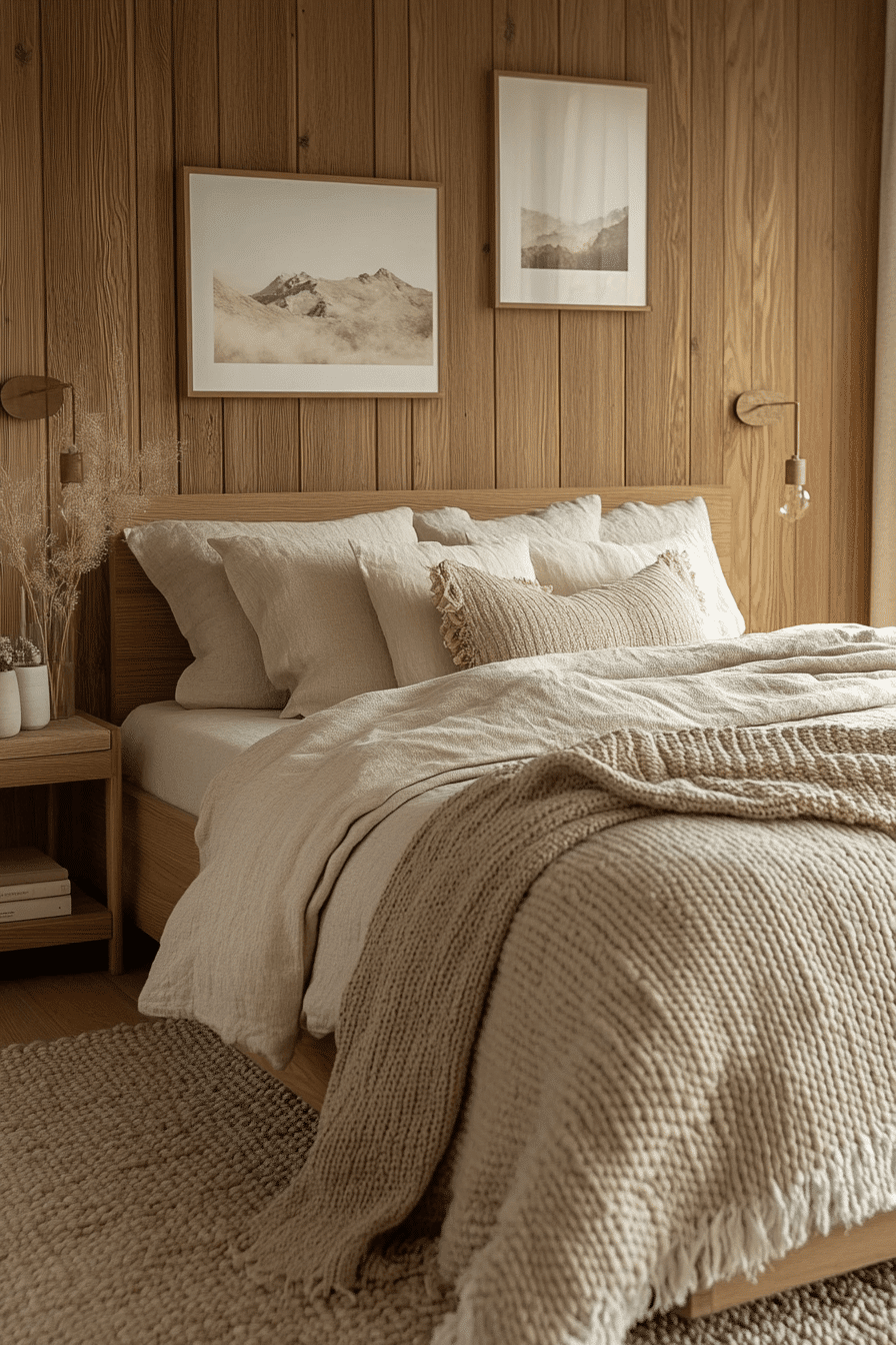 Deep wood tones and earthy textures inspire cozy natural wood bedroom ideas that echo the tranquility of the forest. Rich walnut or cedar furniture pairs beautifully with moss greens and soft neutral decor. Natural elements such as stone accents and leafy plants enhance the organic atmosphere. Layered blankets and warm lighting create a peaceful and comforting mood. The bedroom feels like a quiet retreat connected to nature. Tap to explore woodland-inspired bedroom beauty.