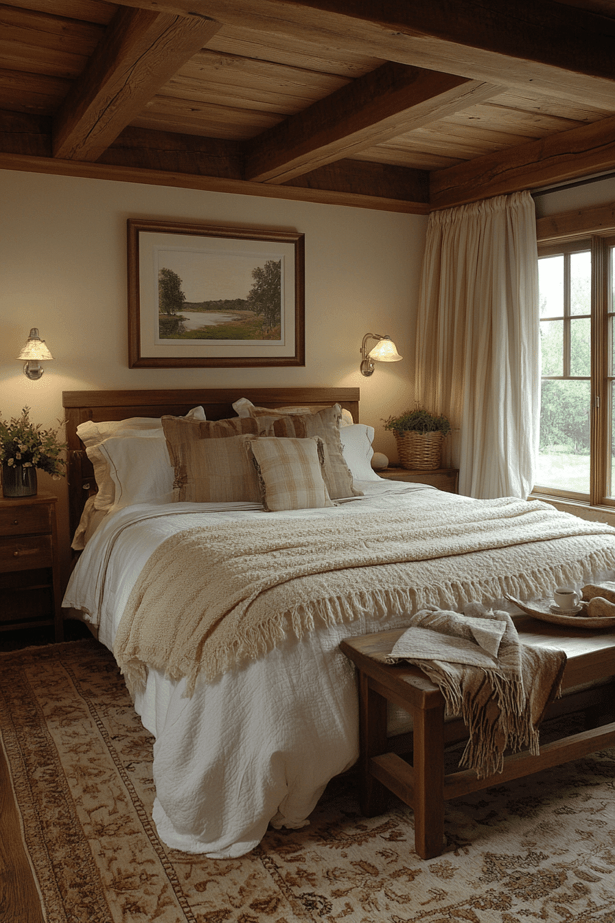 Soft neutrals and exposed timber create peaceful natural wood bedroom ideas that feel light and restorative. Blonde woods such as pine or white oak add a fresh, natural presence without overpowering the room. White bedding, pale walls, and woven baskets enhance the gentle and airy mood. With minimal clutter, the natural materials shine beautifully. The design embraces calm simplicity and timeless warmth. Tap to experience the charm of natural wood serenity.