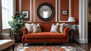 Ruddy rust glows against deep reds and antique gold for layered warmth. Luxe textiles add depth you can feel. The palette invites both lively chats and cozy naps. It’s radiant from morning to midnight.