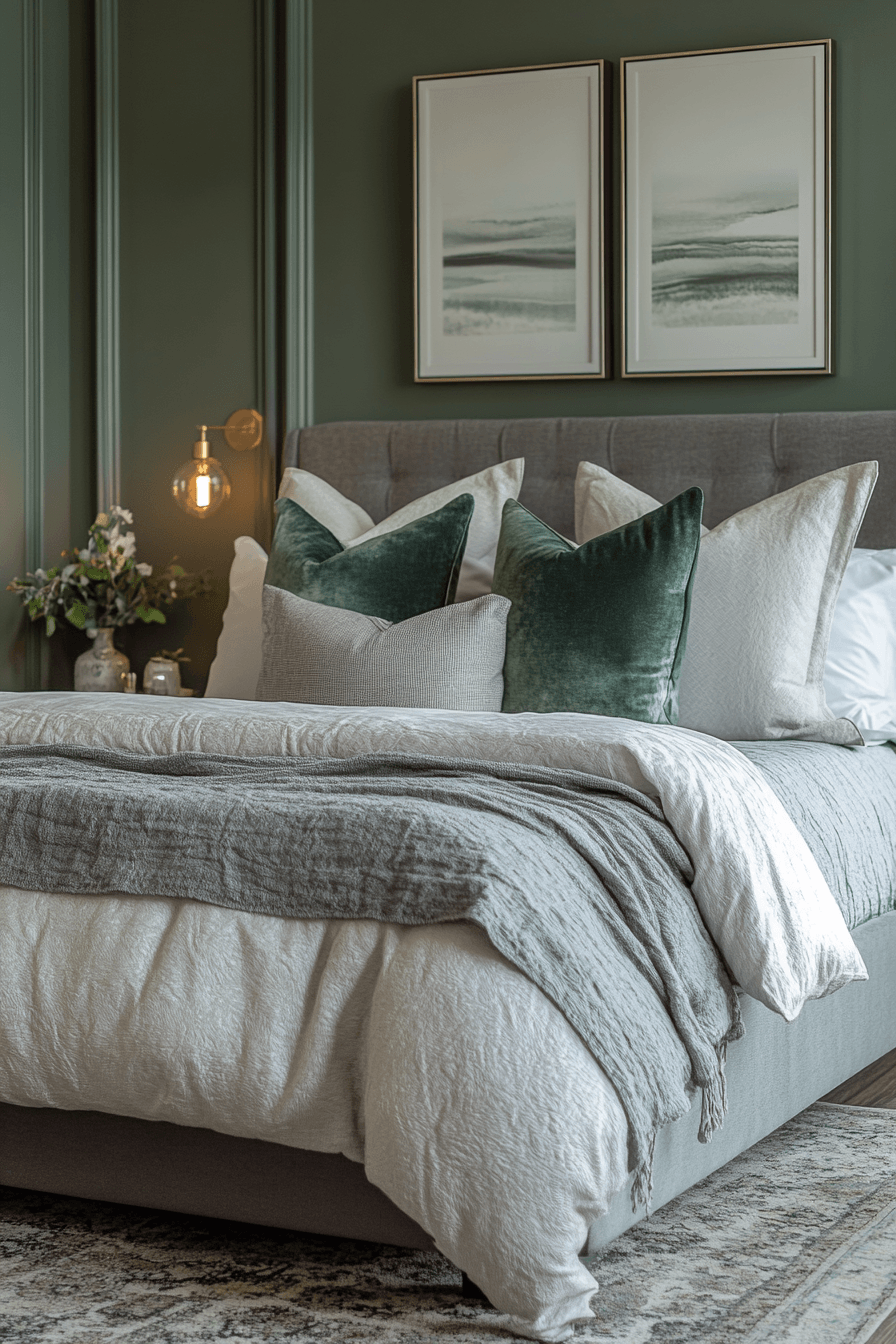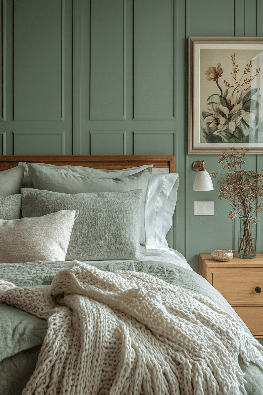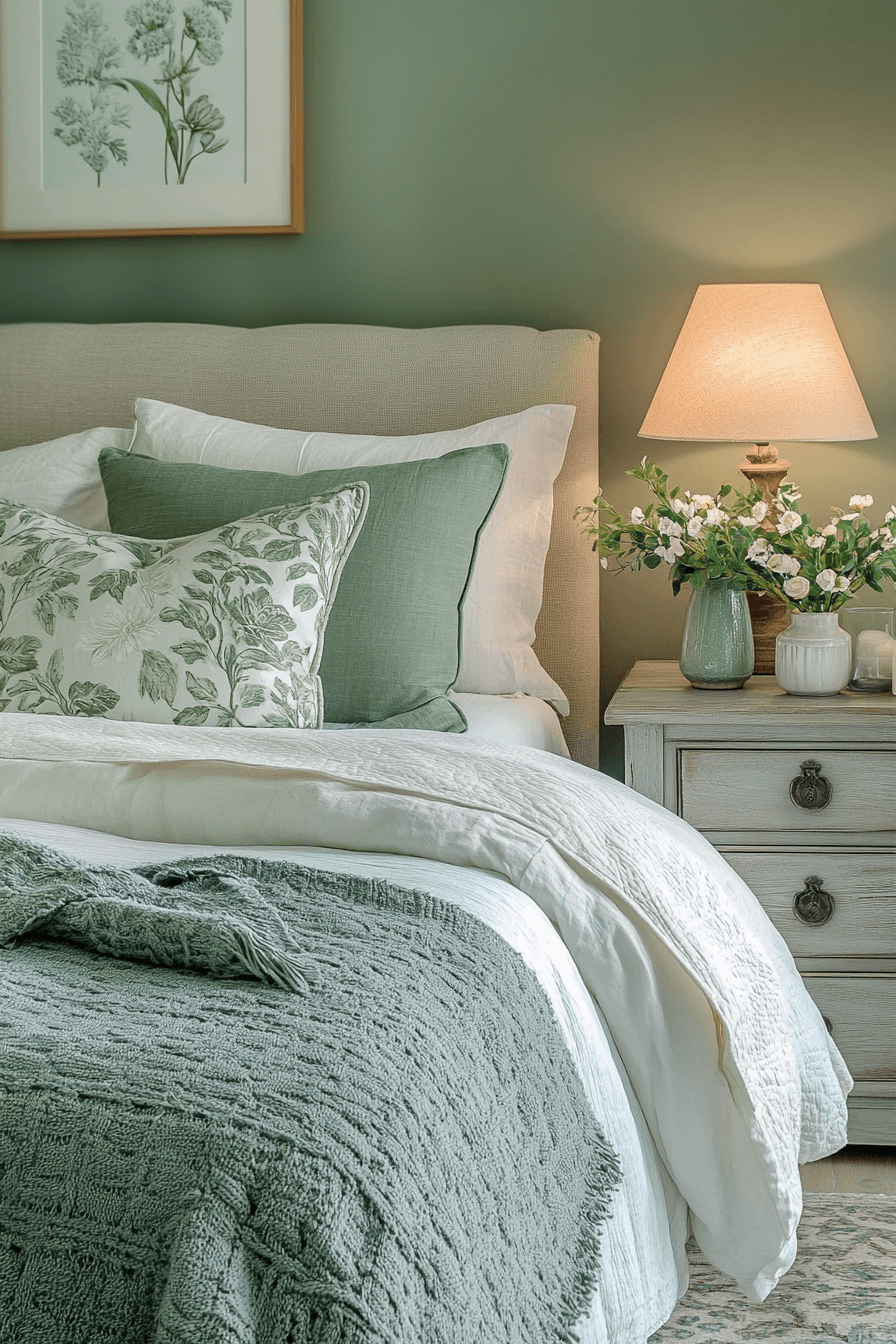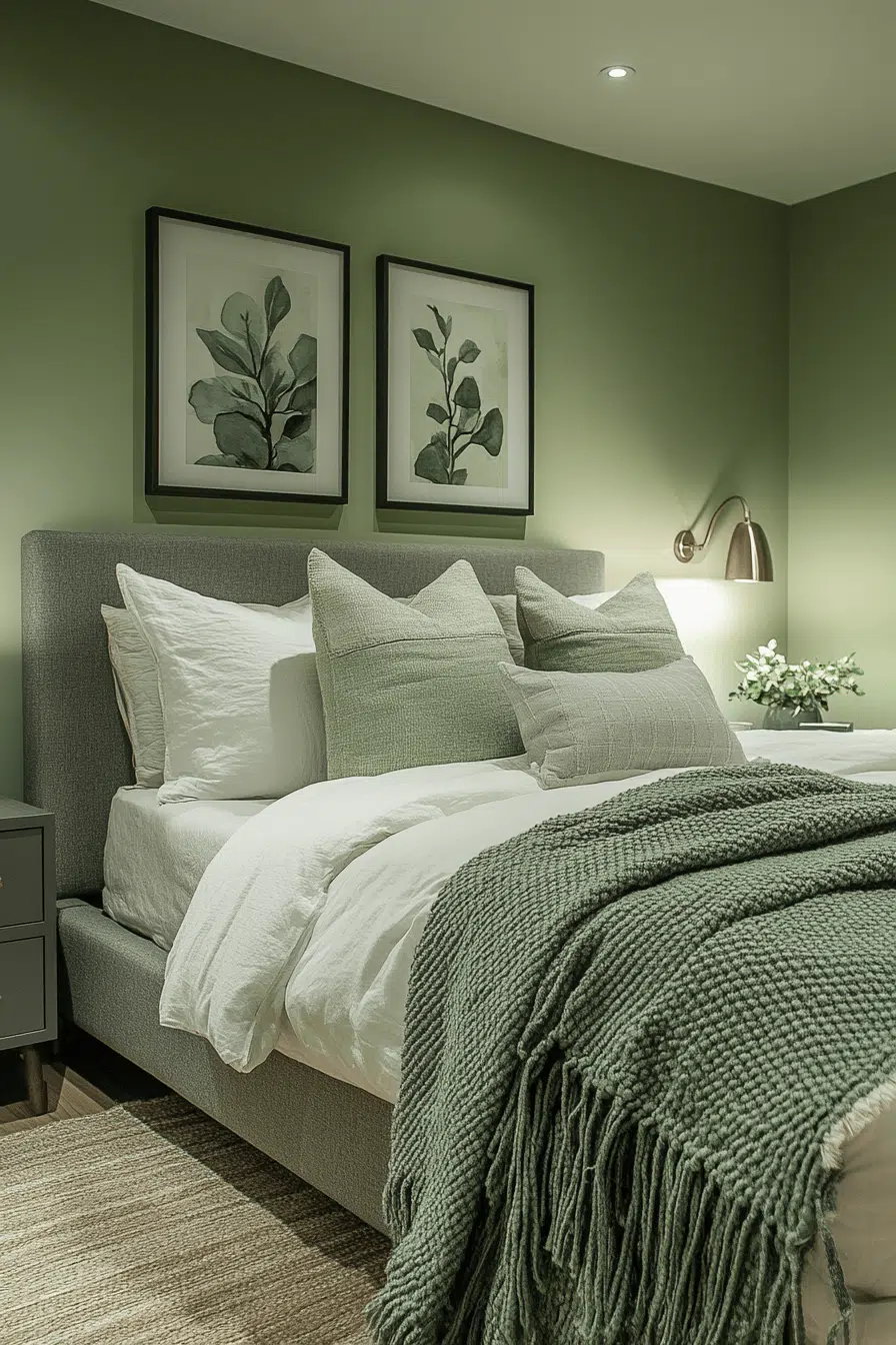 Soft accents add warmth to a cozy sage green and grey bedroom. Sage walls wrap the room in calming color. Grey throws and cushions introduce gentle texture. Subtle lighting enhances the inviting atmosphere. The space feels balanced and comforting. Discover more cozy sage green and grey bedroom inspiration.