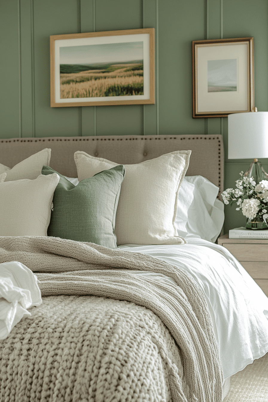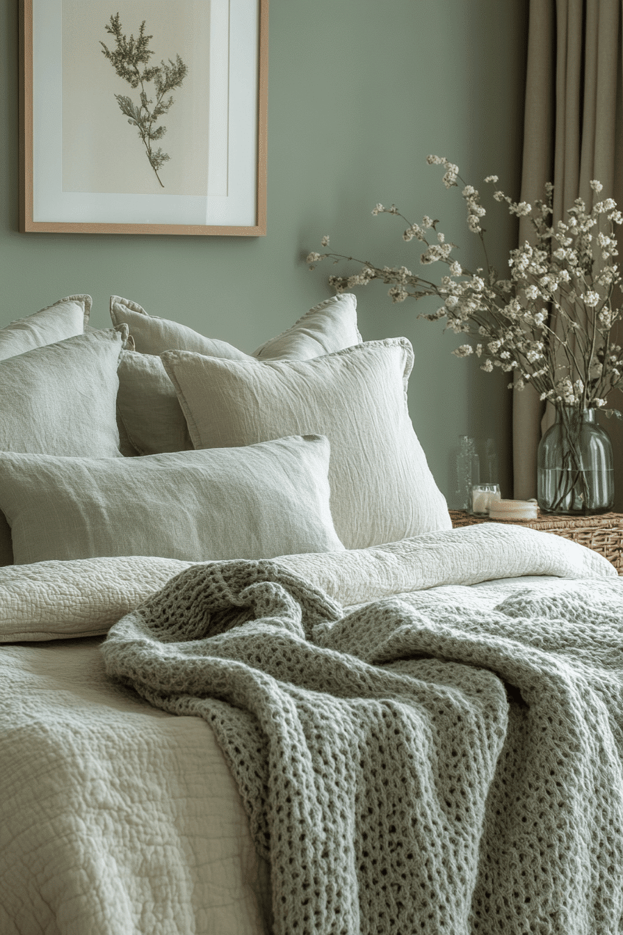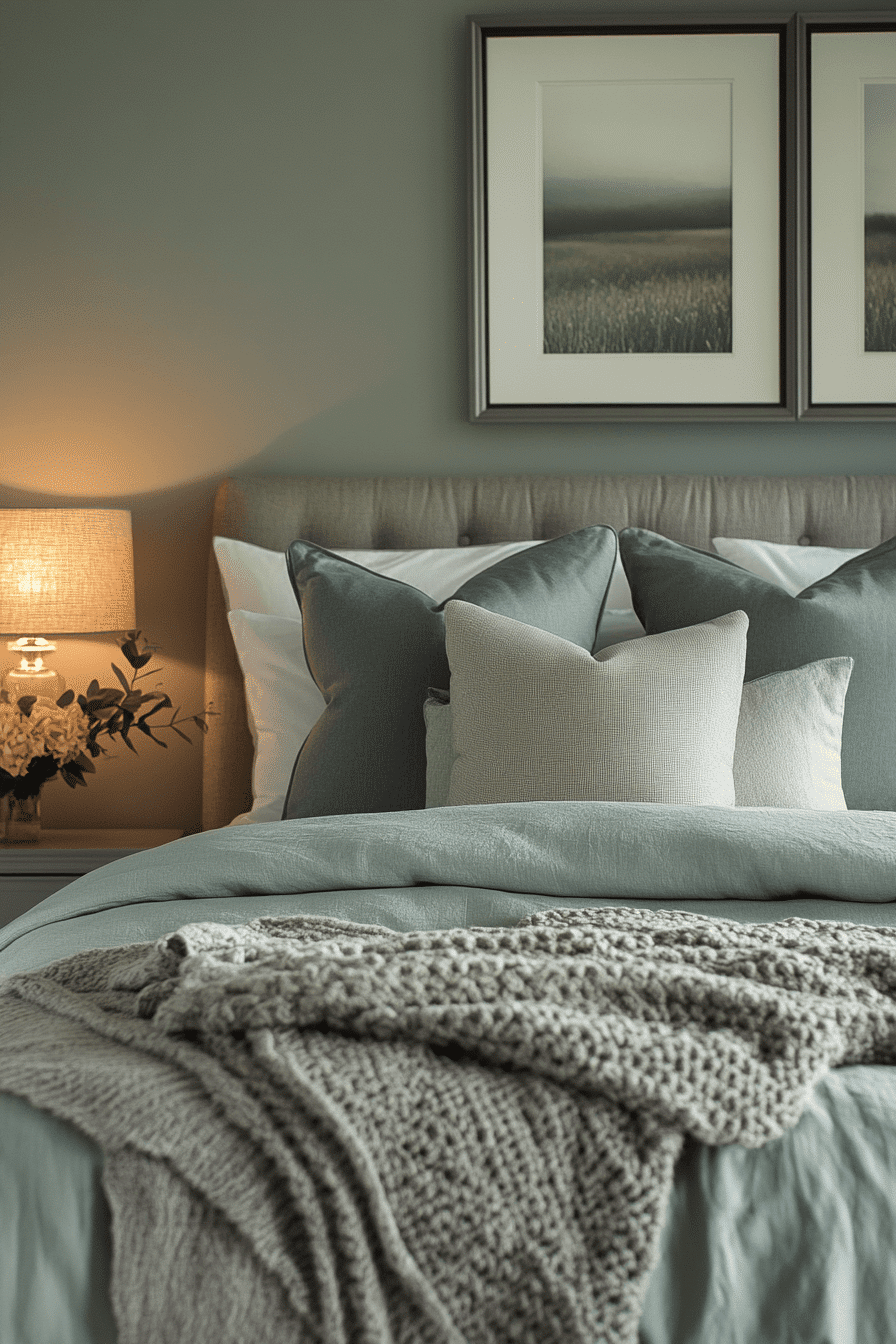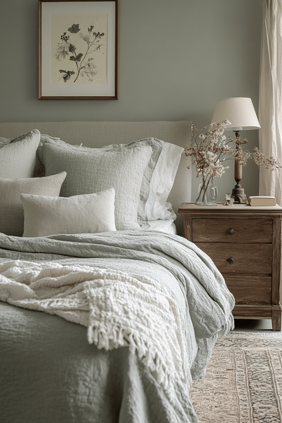 Soft accents add warmth to a cozy sage green and grey bedroom. Sage walls wrap the room in calming color. Grey throws and cushions introduce gentle texture. Subtle lighting enhances the inviting atmosphere. The space feels balanced and comforting. Discover more cozy sage green and grey bedroom inspiration.