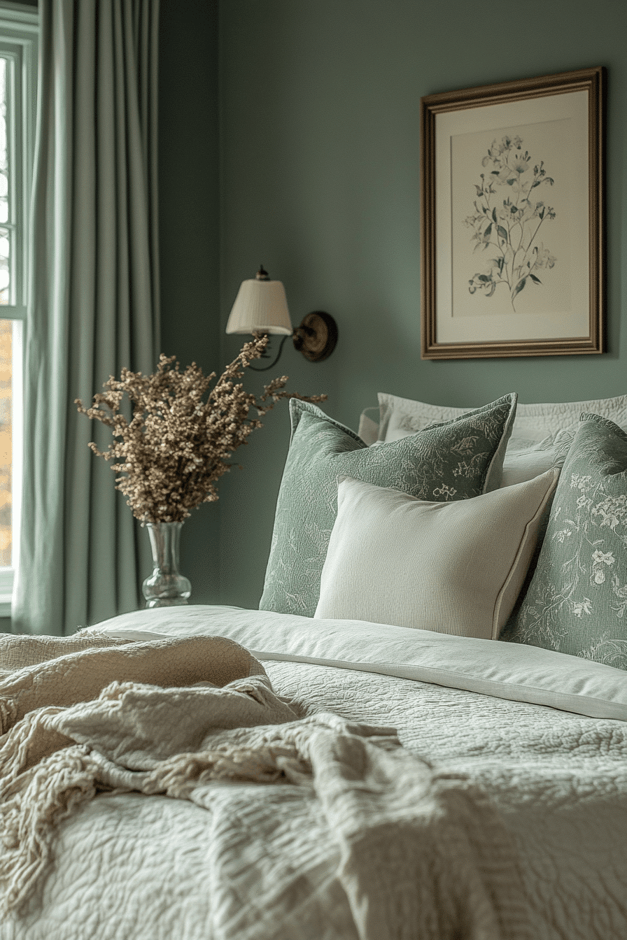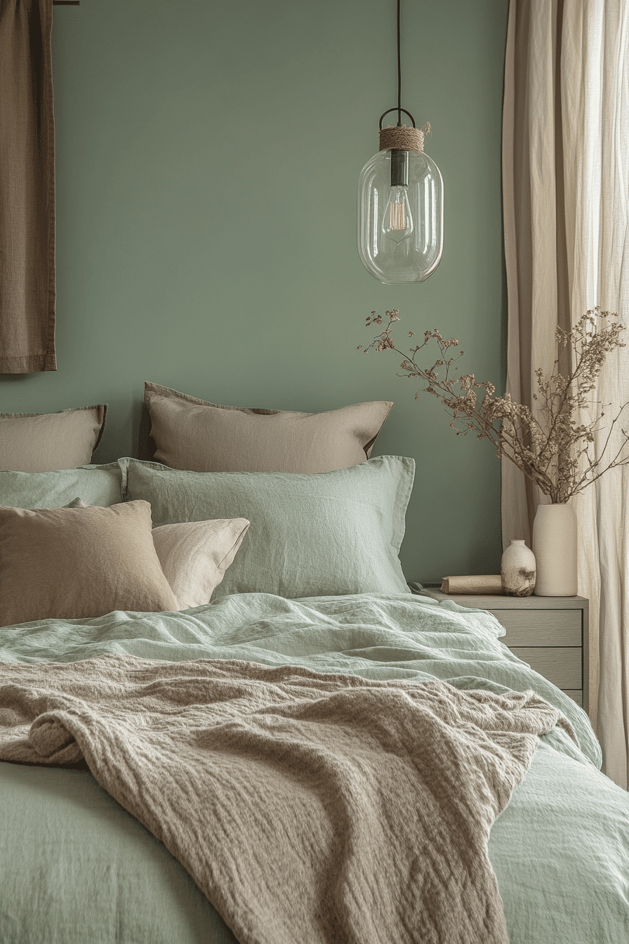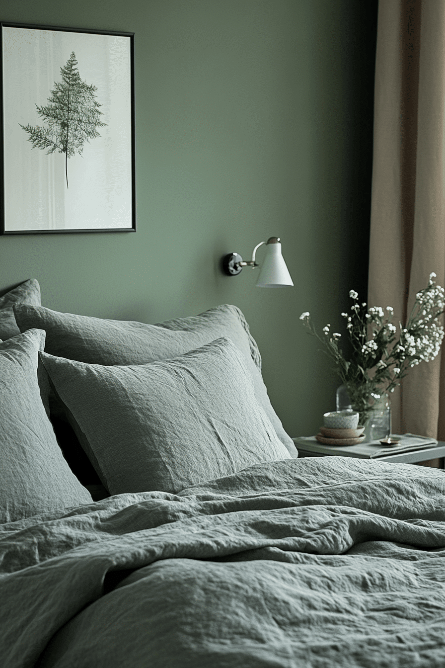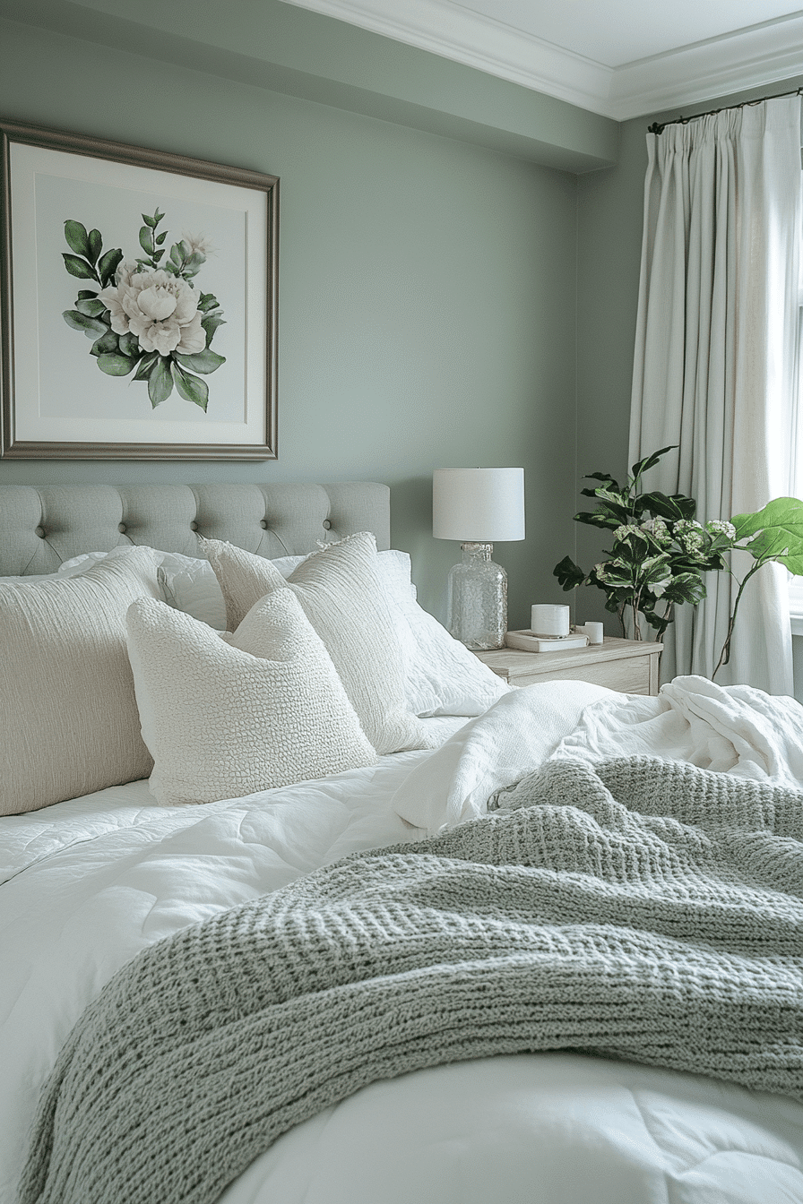 Soft accents add warmth to a cozy sage green and grey bedroom. Sage walls wrap the room in calming color. Grey throws and cushions introduce gentle texture. Subtle lighting enhances the inviting atmosphere. The space feels balanced and comforting. Discover more cozy sage green and grey bedroom inspiration.