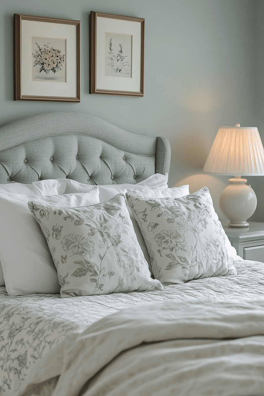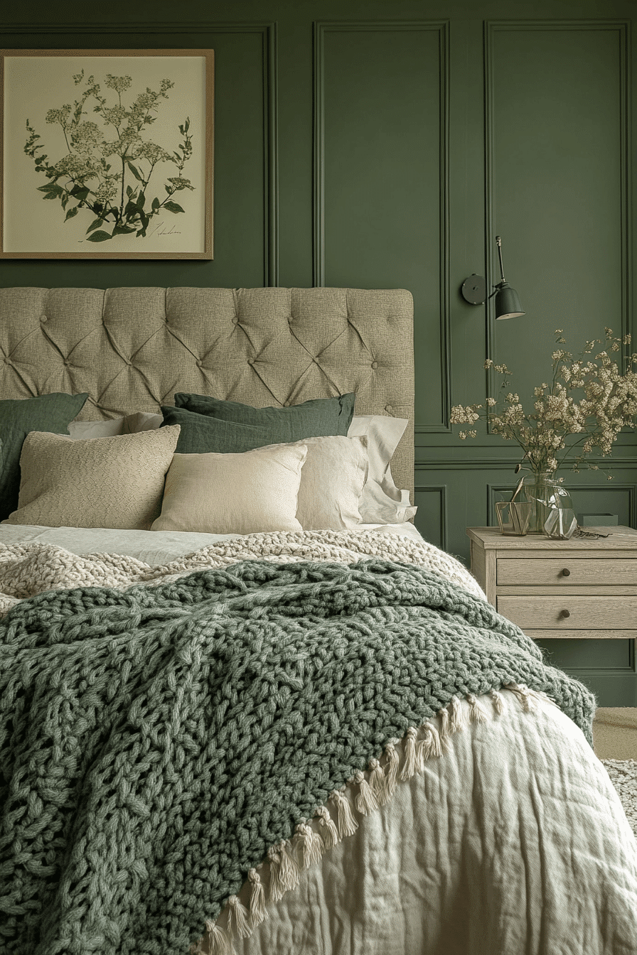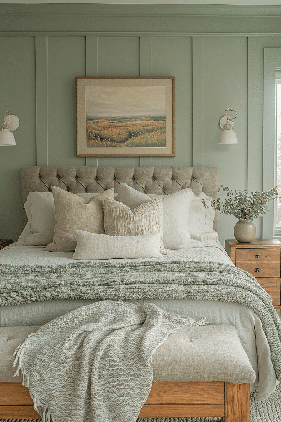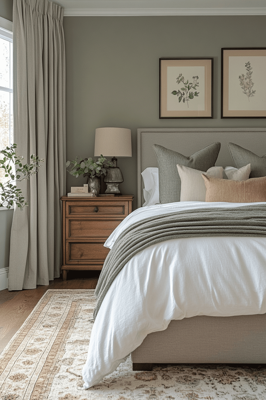 Soft accents add warmth to a cozy sage green and grey bedroom. Sage walls wrap the room in calming color. Grey throws and cushions introduce gentle texture. Subtle lighting enhances the inviting atmosphere. The space feels balanced and comforting. Discover more cozy sage green and grey bedroom inspiration.