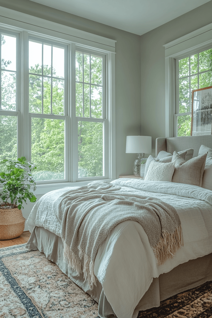 Warm textures bring extra comfort to a sage green and grey bedroom. Muted green and grey tones work together seamlessly. Plush bedding layers introduce coziness without clutter. Neutral accents keep the room airy and bright. The palette feels welcoming and calm. Browse more cozy sage green and grey bedroom ideas.