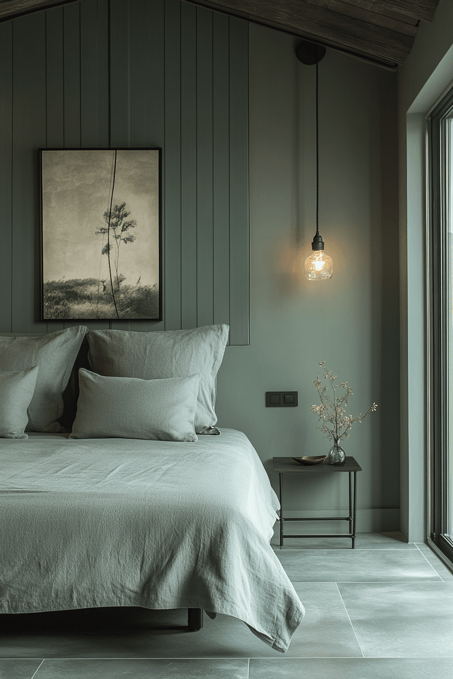 A peaceful environment emerges inside a well-balanced sage green and grey bedroom. Gentle green tones introduce serenity while grey accents add depth. Neutral décor keeps the palette harmonious. Warm lighting enhances the calming ambiance. The bedroom becomes a relaxing retreat. Explore more tranquil sage green and grey bedroom inspiration.