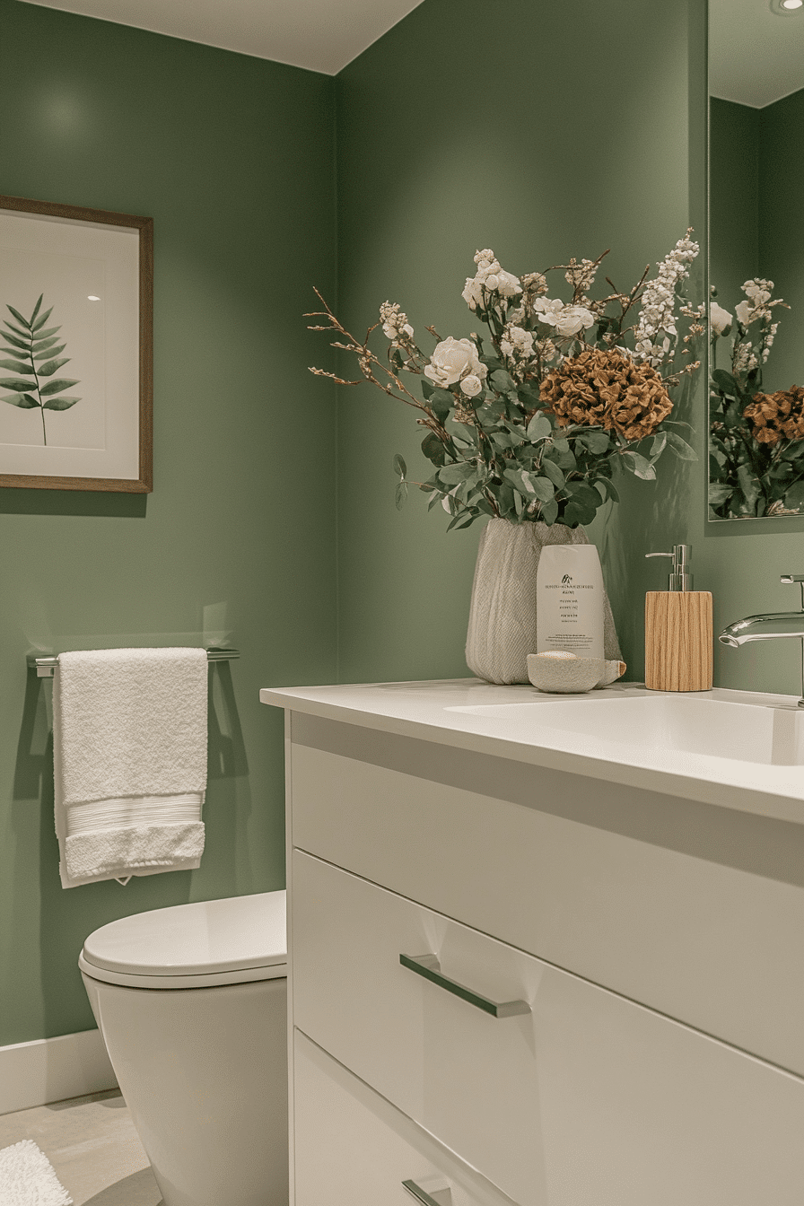 A polished finish adds subtle depth to a sage green bathroom styled with modern elegance. Glossy or matte green surfaces create visual texture. Neutral countertops balance the palette. Sleek fixtures reinforce the contemporary design. The bathroom feels sophisticated and calm. See more refined sage bathroom inspiration.