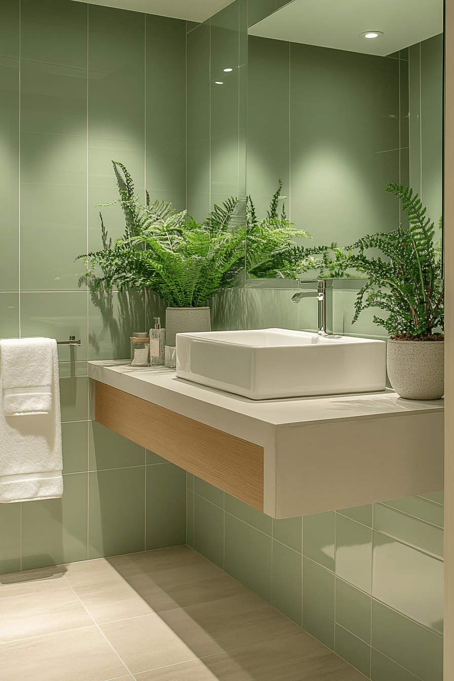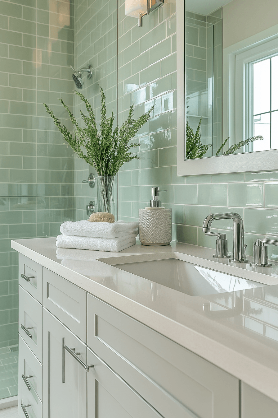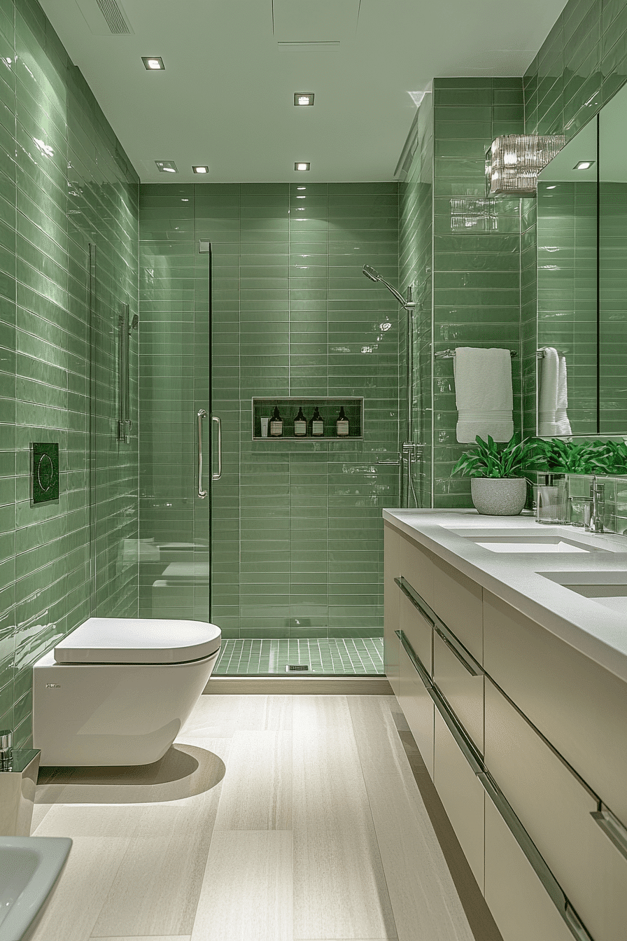 Minimal design details bring effortless elegance to a sage green bathroom styled with sleek finishes. Glossy sage tiles reflect light and create a refined appearance. Compact storage keeps the layout organized and uncluttered. Neutral countertops and mirrors brighten the room. The space feels both modern and sophisticated. Discover more sleek sage bathroom ideas.