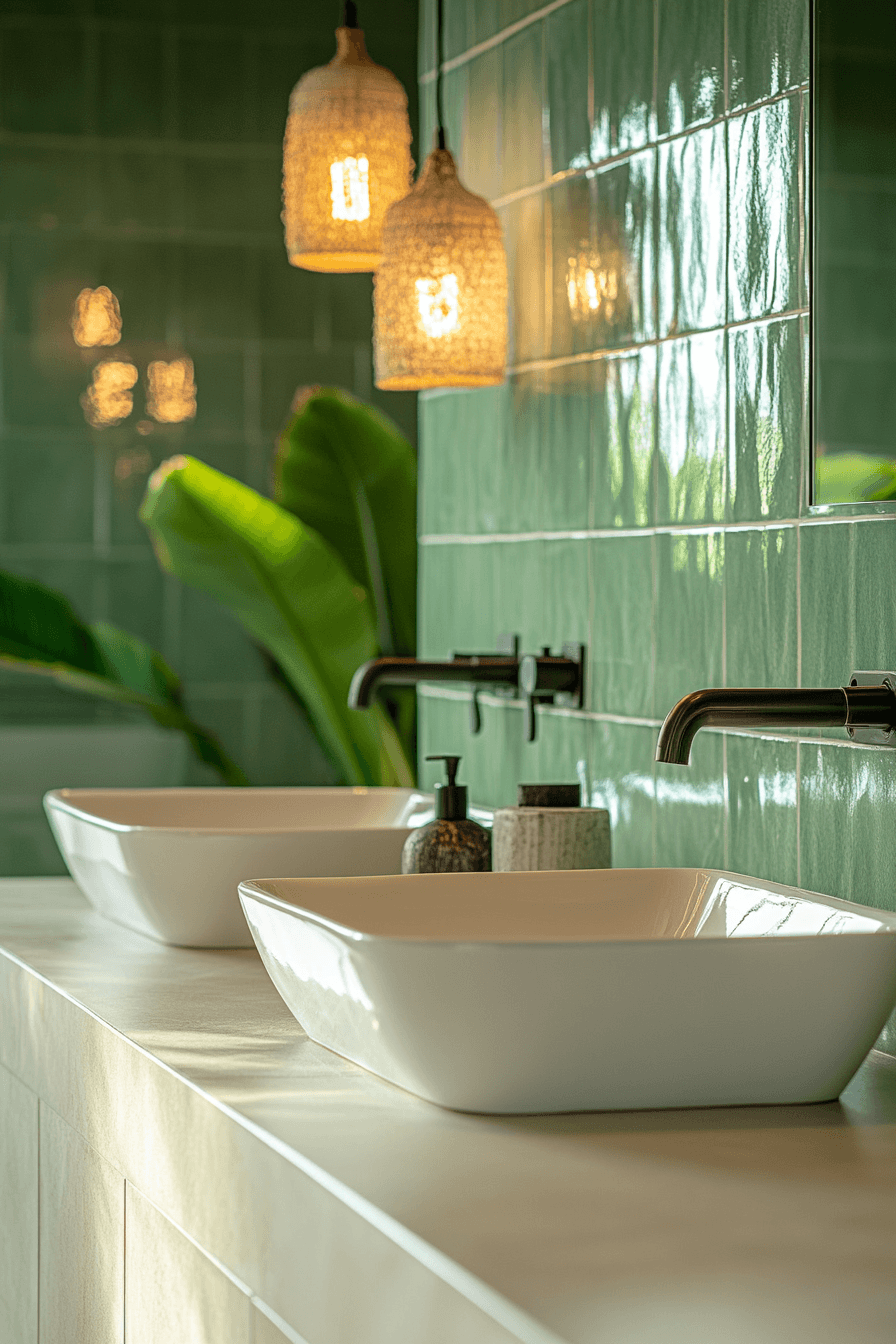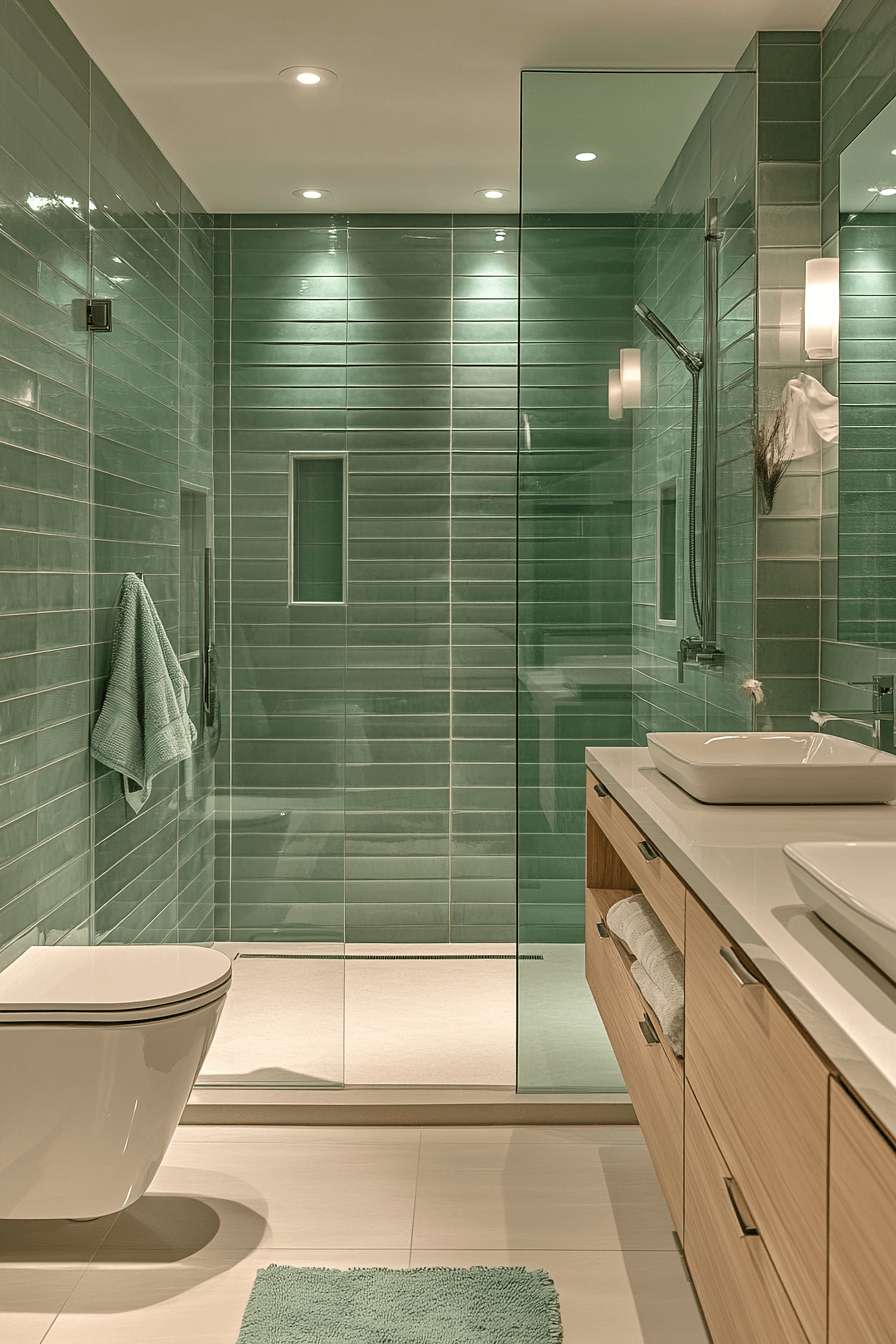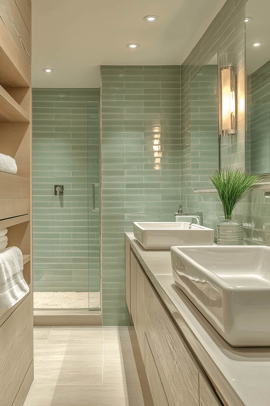 Minimal design details bring effortless elegance to a sage green bathroom styled with sleek finishes. Glossy sage tiles reflect light and create a refined appearance. Compact storage keeps the layout organized and uncluttered. Neutral countertops and mirrors brighten the room. The space feels both modern and sophisticated. Discover more sleek sage bathroom ideas.