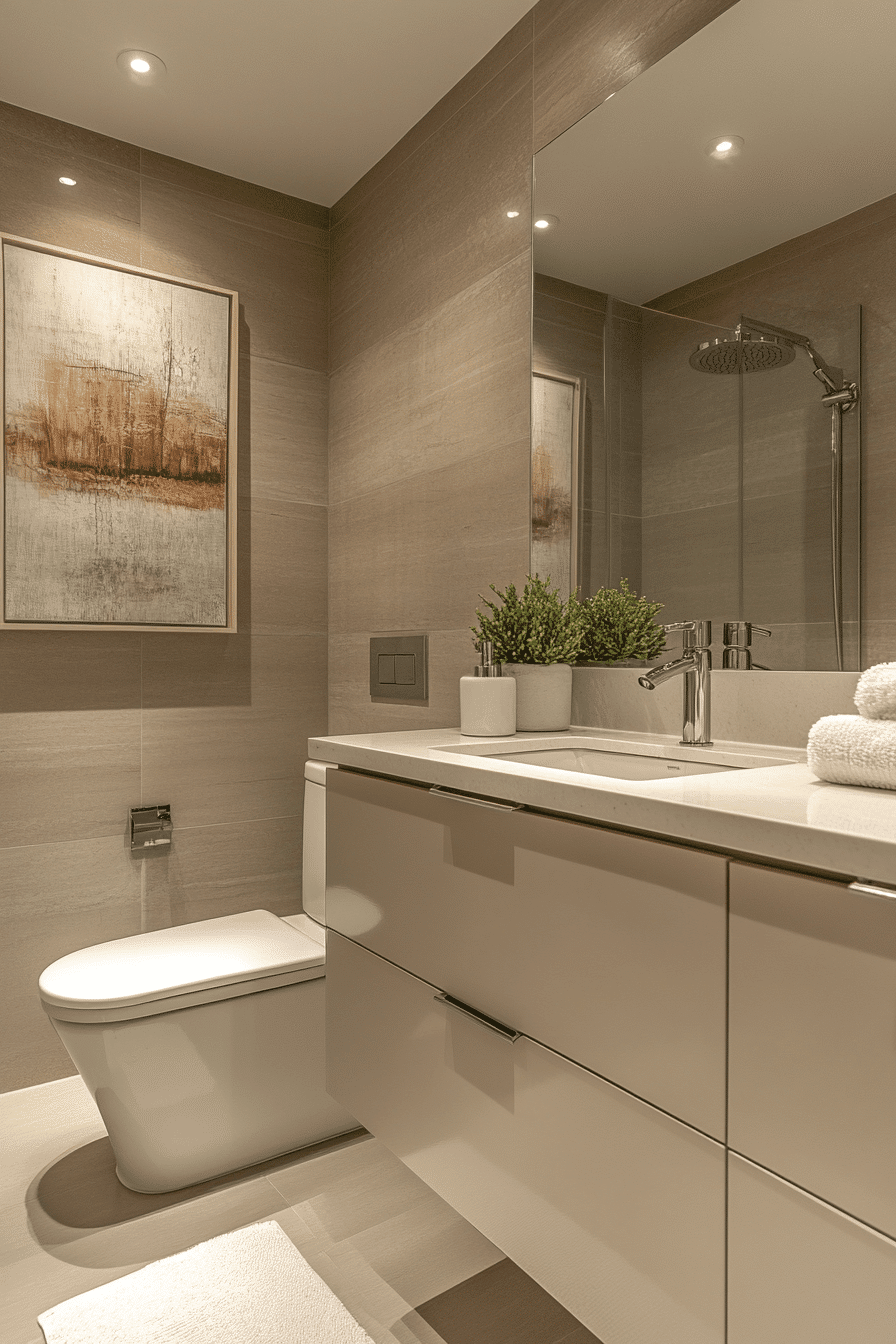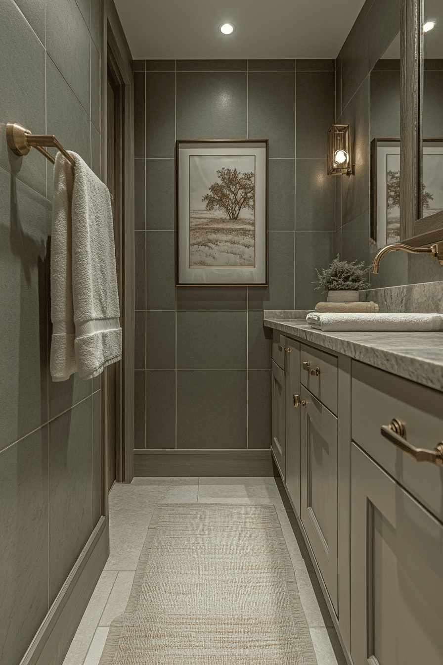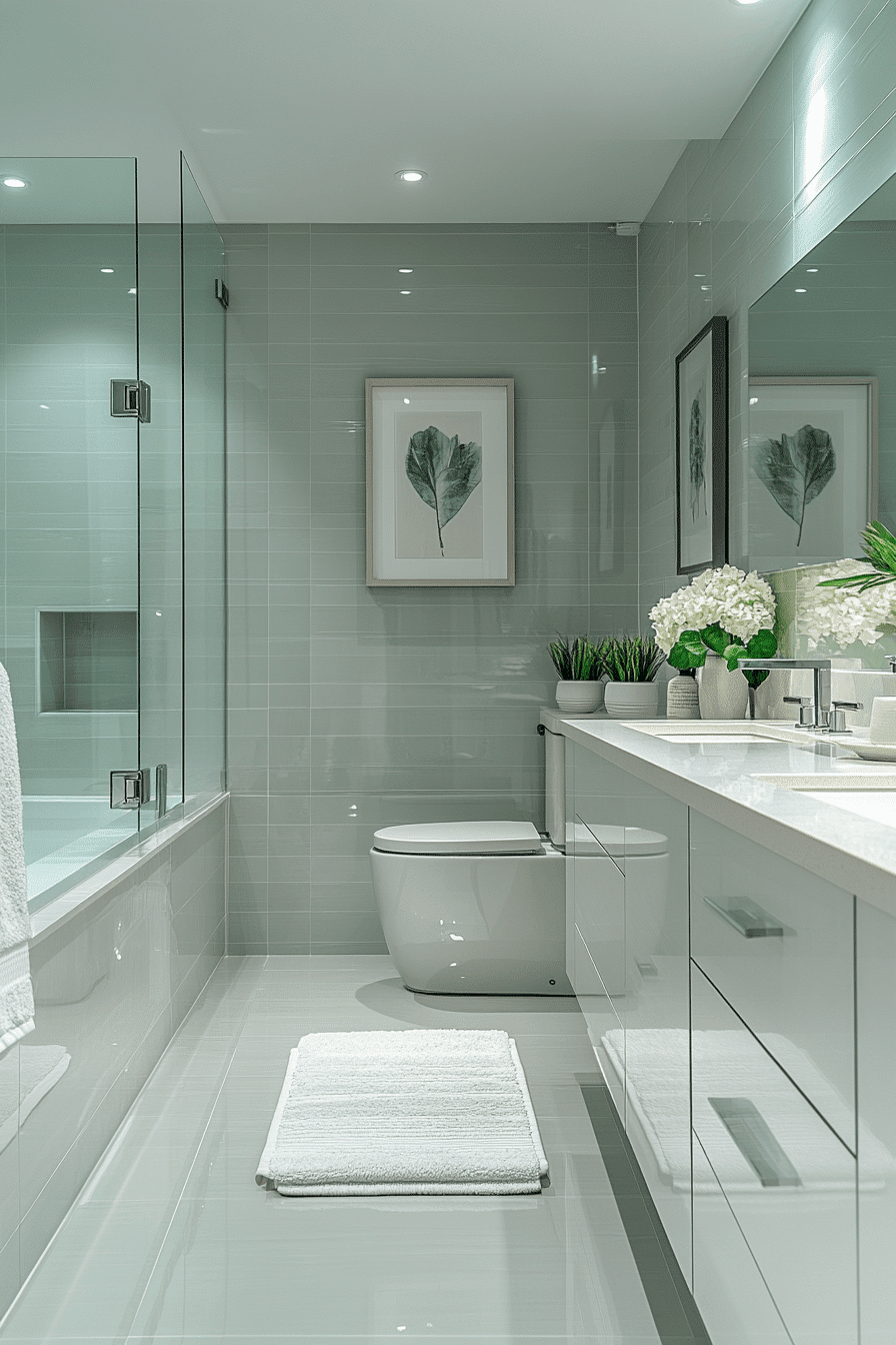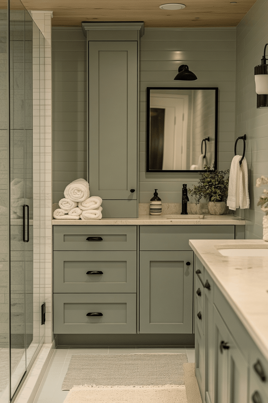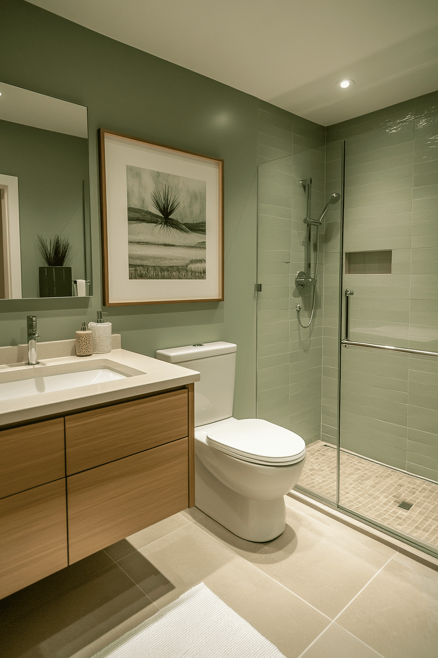 Sleek finishes enhance the sophistication of a sage green bathroom styled with polished details. Glossy tiles reflect light and emphasize the calming palette. Neutral countertops maintain balance. Slim hardware introduces modern elegance. The design feels refined and contemporary. Discover more polished sage bathroom ideas.