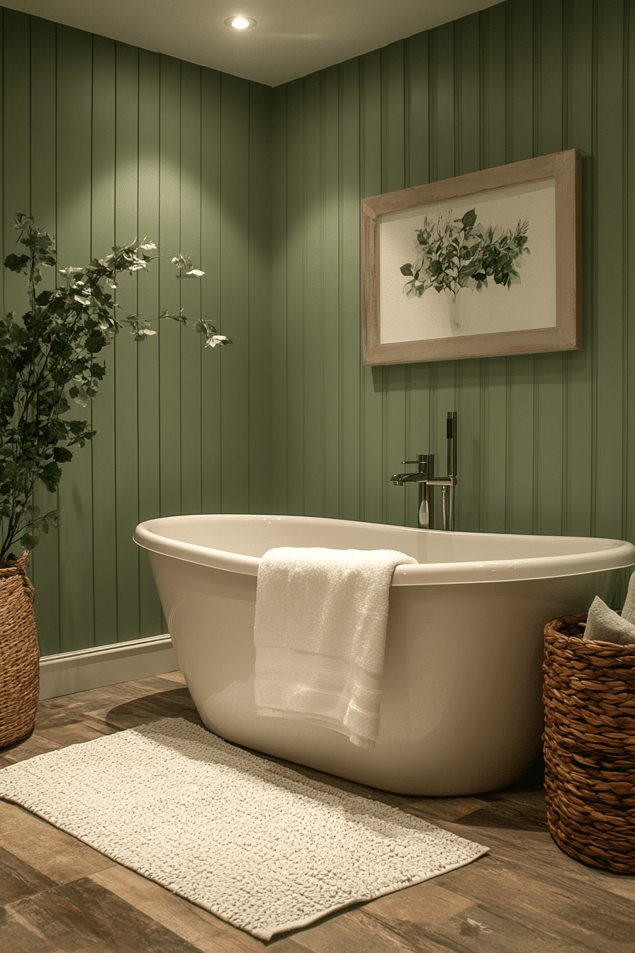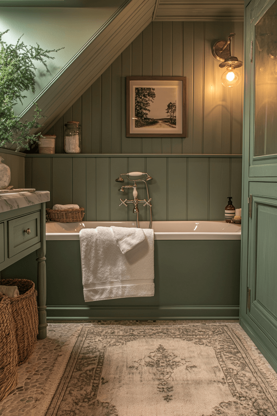 Warm textures create a luxurious mood inside a sage green bathroom filled with cozy charm. Sage walls provide a soothing base. Plush accents like towels introduce comfort. Neutral finishes maintain balance. Lighting highlights the calming elegance. Explore more cozy luxe sage bathroom inspiration.