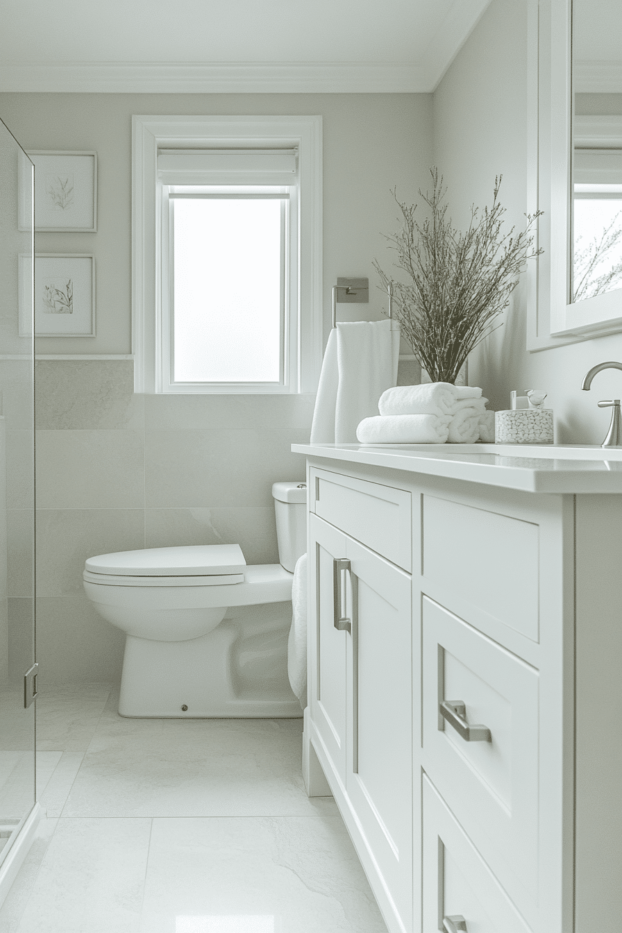 Muted green tones can transform a sage green bathroom into a peaceful sanctuary. Neutral finishes keep the design balanced and bright. Slim fixtures maintain a clean aesthetic. Soft lighting enhances the soothing palette. The bathroom feels restorative and tranquil. Browse more pure sage bathroom inspiration.