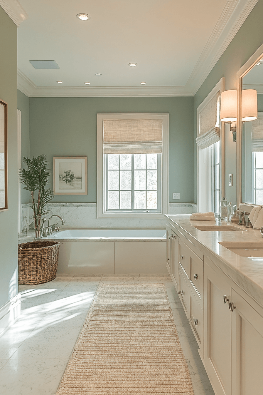 Fresh tones define a sage green bathroom that embraces simplicity and tranquility. Light green walls brighten the space gently. Neutral finishes enhance the sense of openness. Slim cabinetry keeps the layout uncluttered. The room feels inviting and refreshing. Browse more clean sage bathroom inspiration.