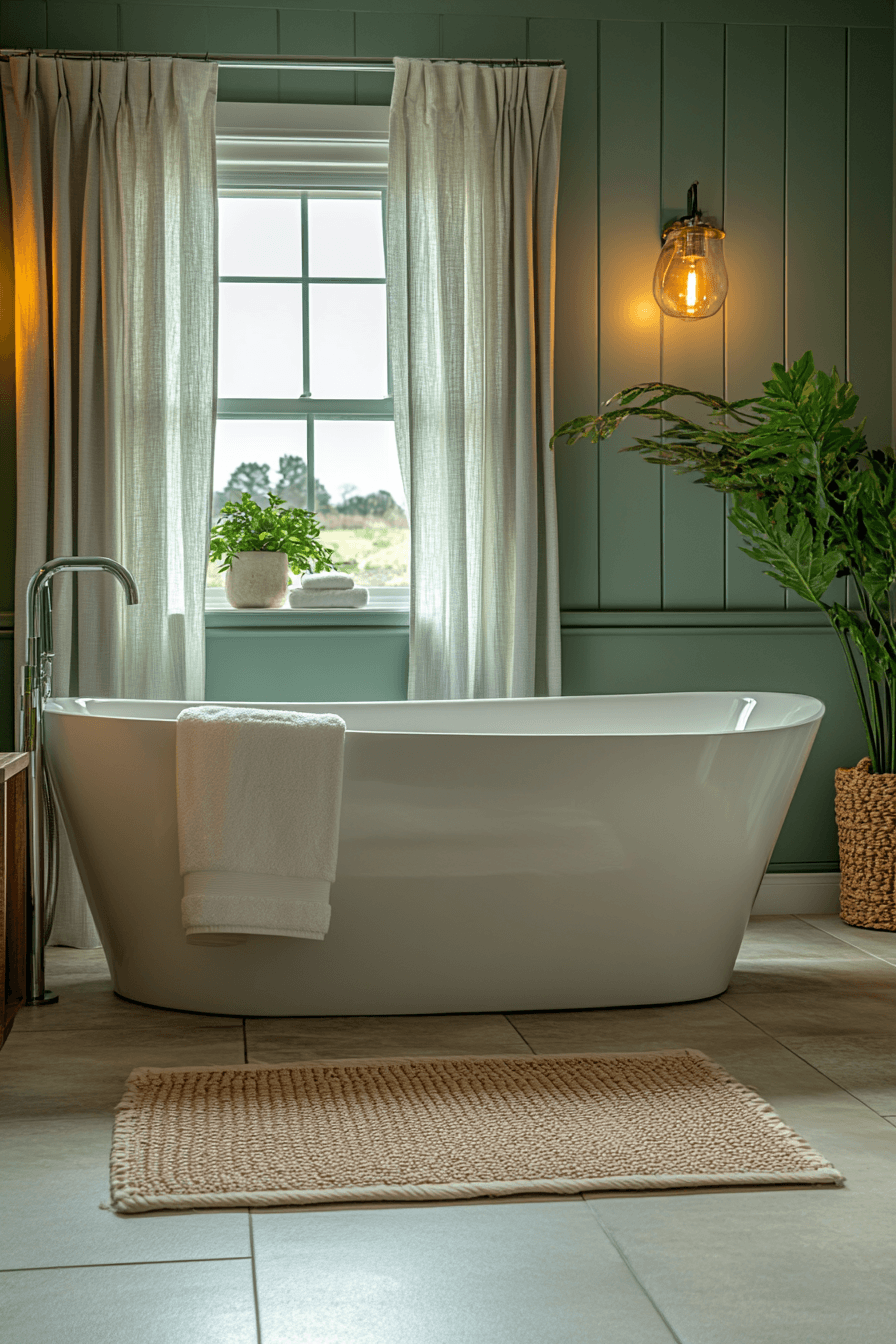 Refined finishes bring subtle luxury to a sage green bathroom styled with elegant touches. Marble counters or polished tiles elevate the gentle green palette. Metallic accents add warmth and sophistication. Soft lighting highlights the serene color beautifully. The space feels indulgent yet welcoming. Explore more luxe sage bathroom inspiration.