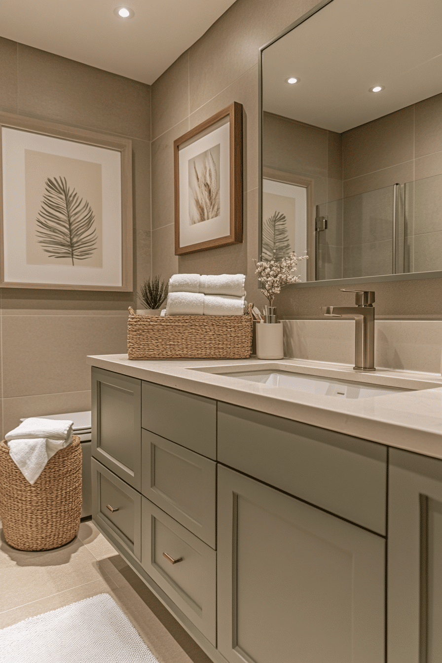 A peaceful zen-inspired atmosphere enhances a sage green bathroom designed for relaxation. Muted green tones encourage calm and balance. Smooth finishes reinforce simplicity. Neutral accents maintain harmony throughout the space. The bathroom becomes a meditative retreat. Browse more sage zen bathroom inspiration.