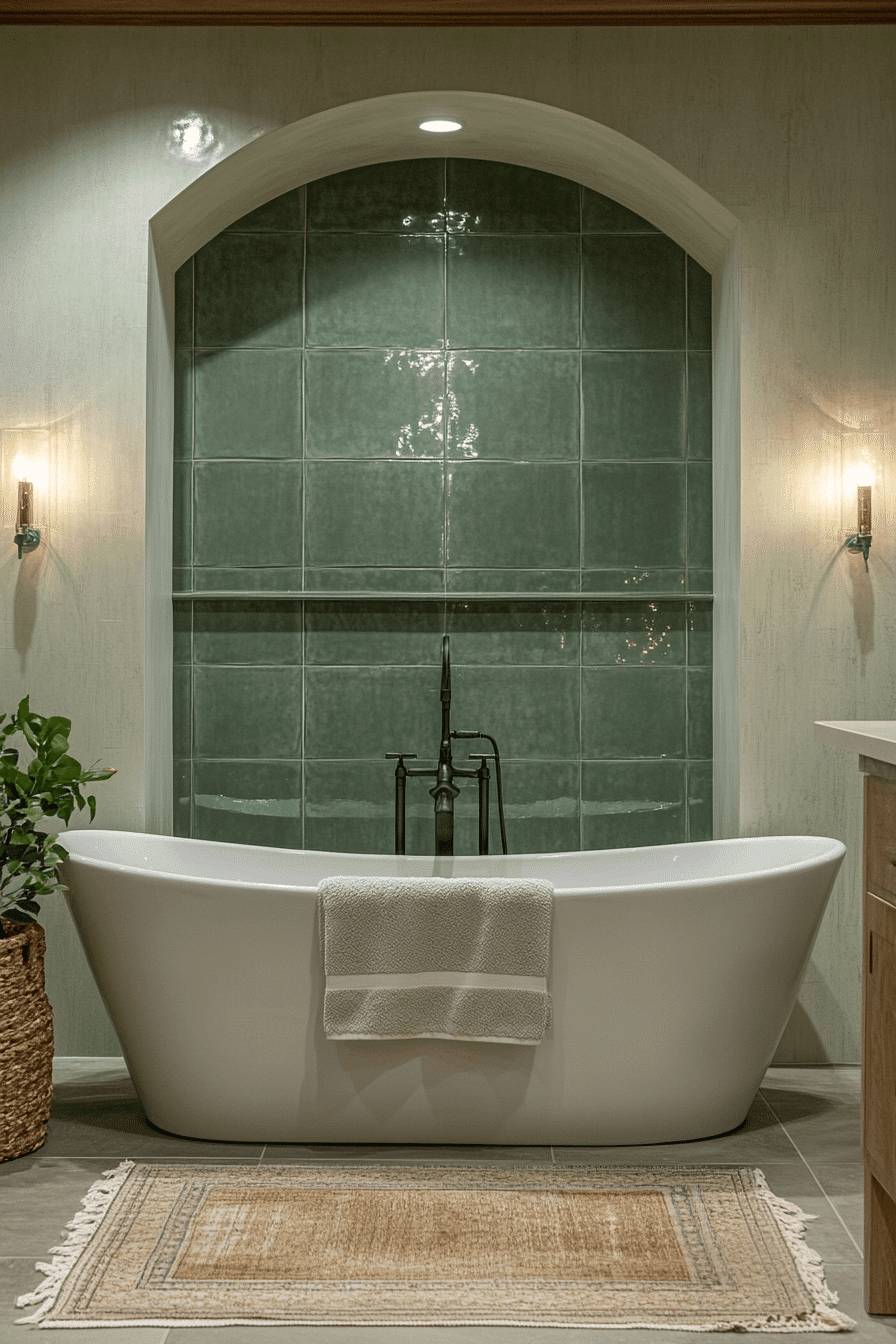 Soft lighting can enhance the peaceful glow of a sage green bathroom. Muted green tiles reflect warm illumination beautifully. Neutral accents maintain visual harmony. Modern fixtures add contemporary style. The room feels soothing and balanced. Browse more serene sage bathroom inspiration.