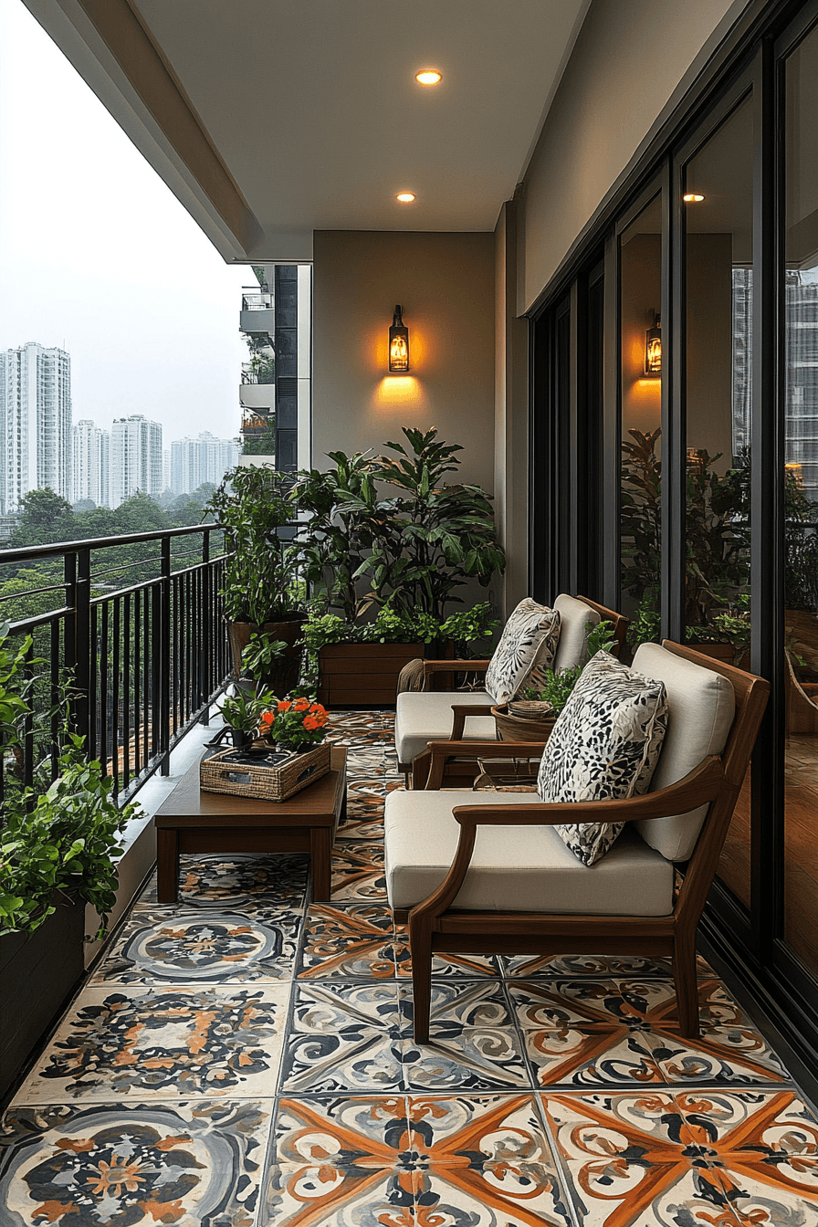 Tile features enhance small balcony design by adding texture and visual interest. Whether patterned or neutral, tiles elevate the entire space. They create a durable and stylish foundation. Pairing with slim furniture keeps the layout balanced. The result feels polished and modern. Upgrade your space with tiled small balcony design ideas now.