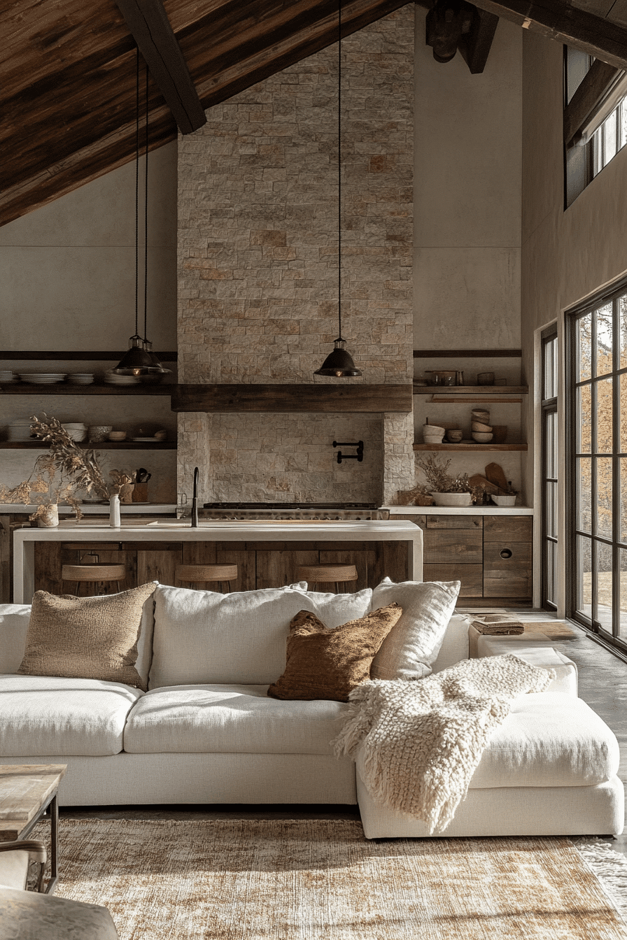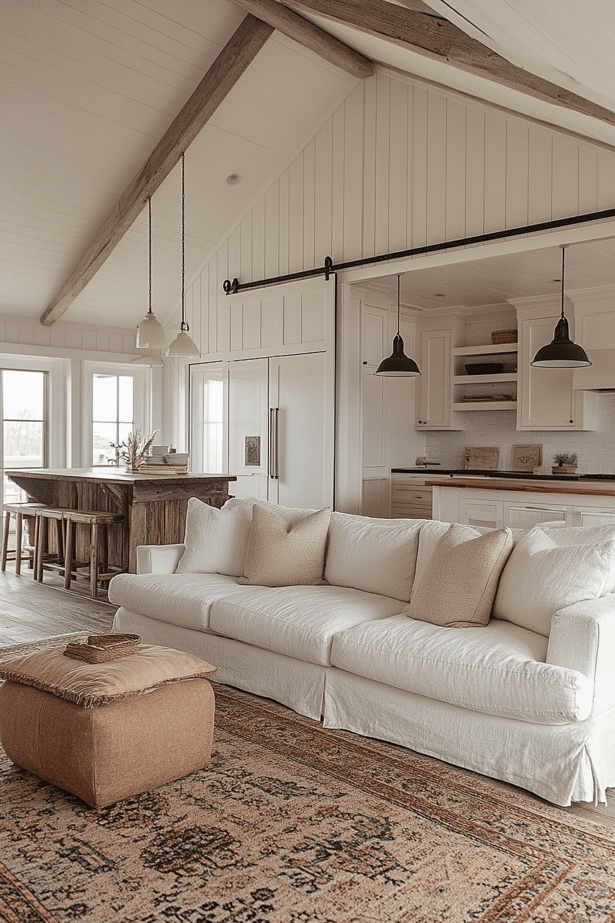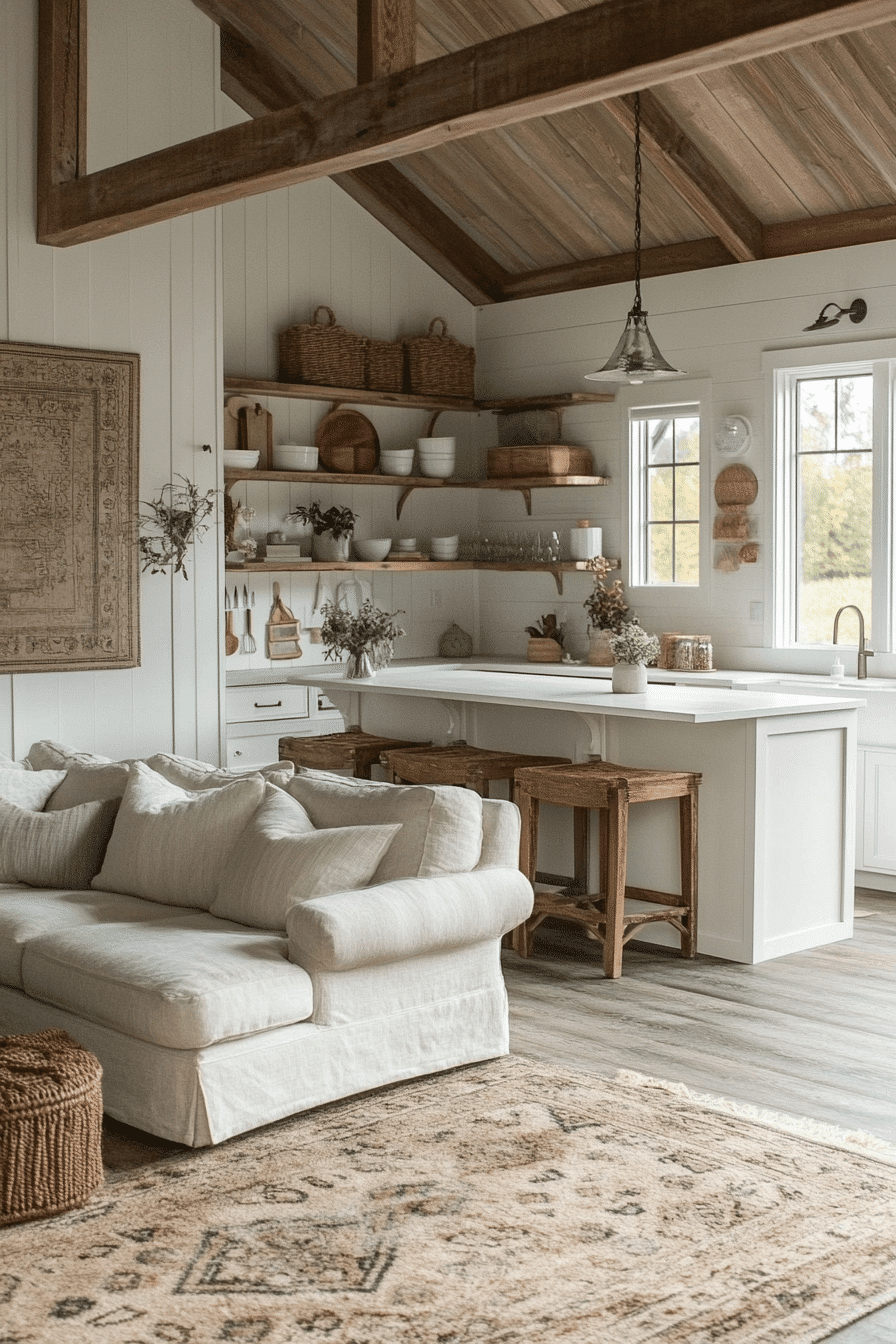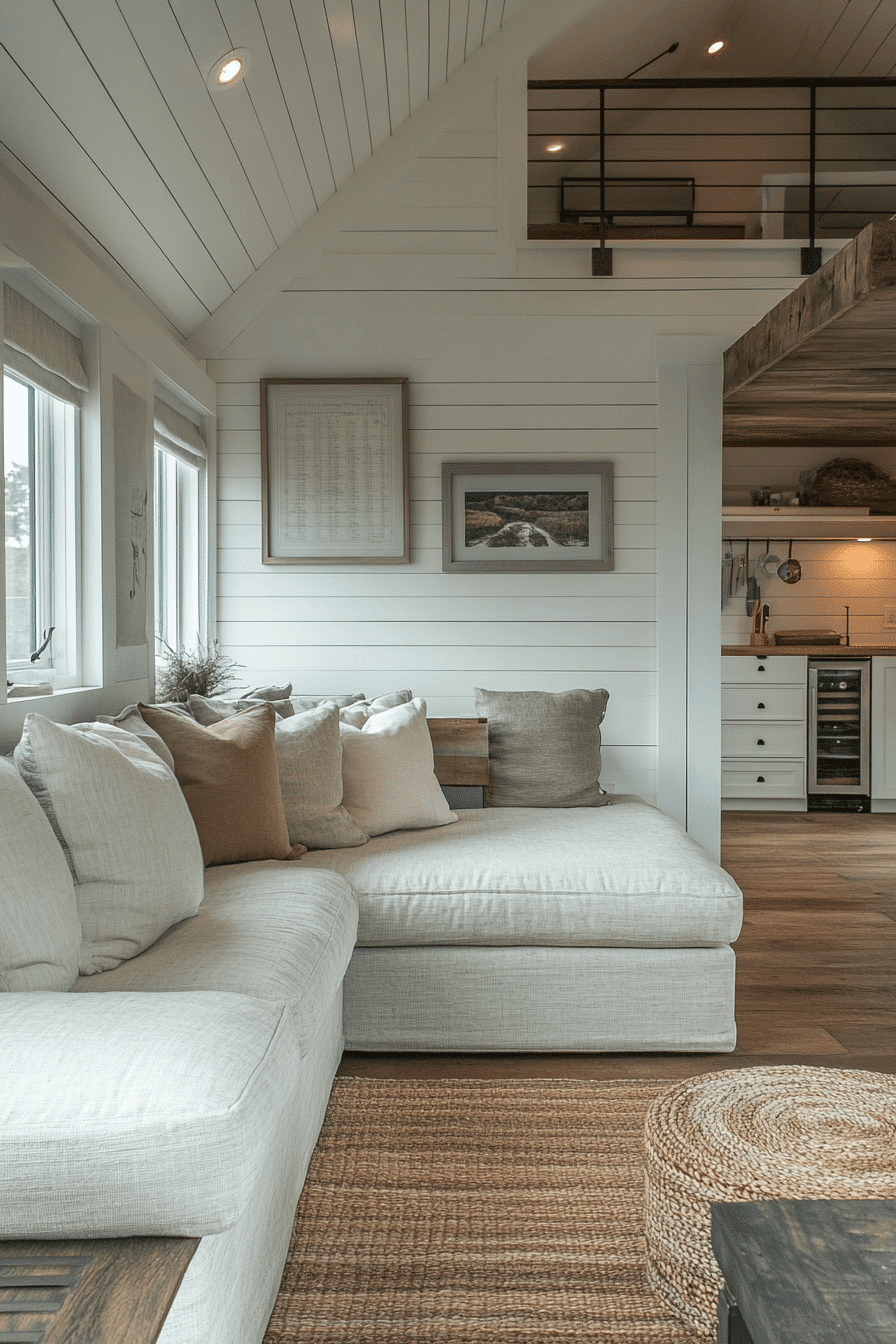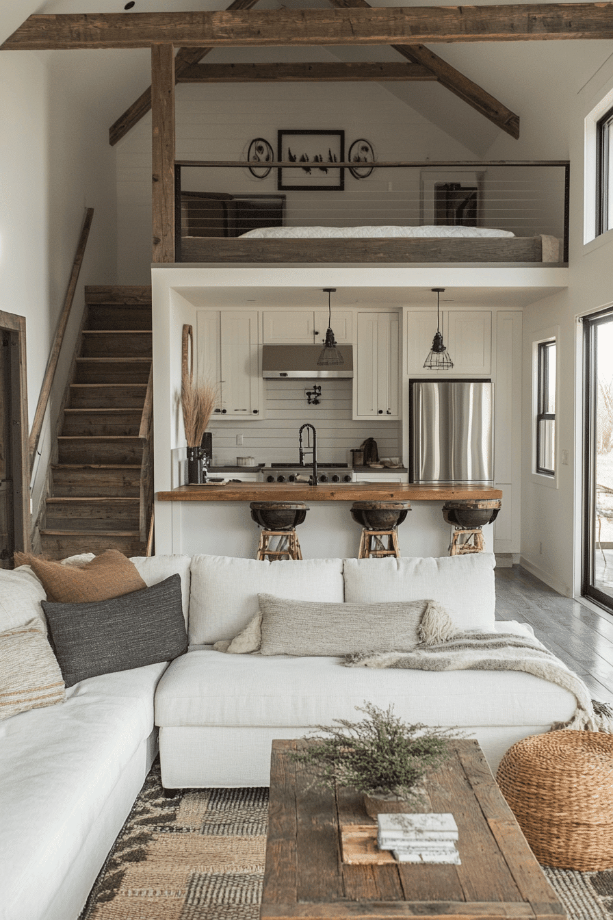 Layered neutrals create depth and softness while maintaining an airy and cohesive look. These small barndominium ideas combine whites, creams, and taupes through textures and finishes. Subtle variation prevents flatness. The design feels warm and balanced. Every detail contributes to comfort. Explore more layered small barndominium ideas for a rich, soft aesthetic.