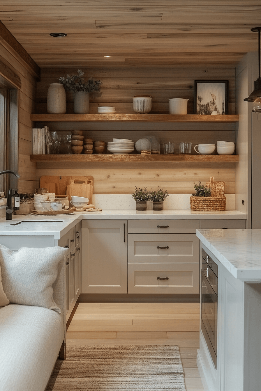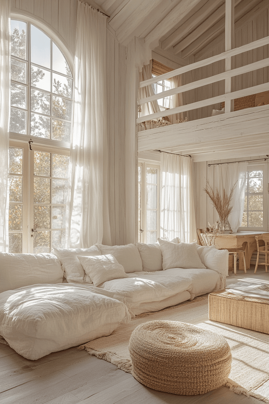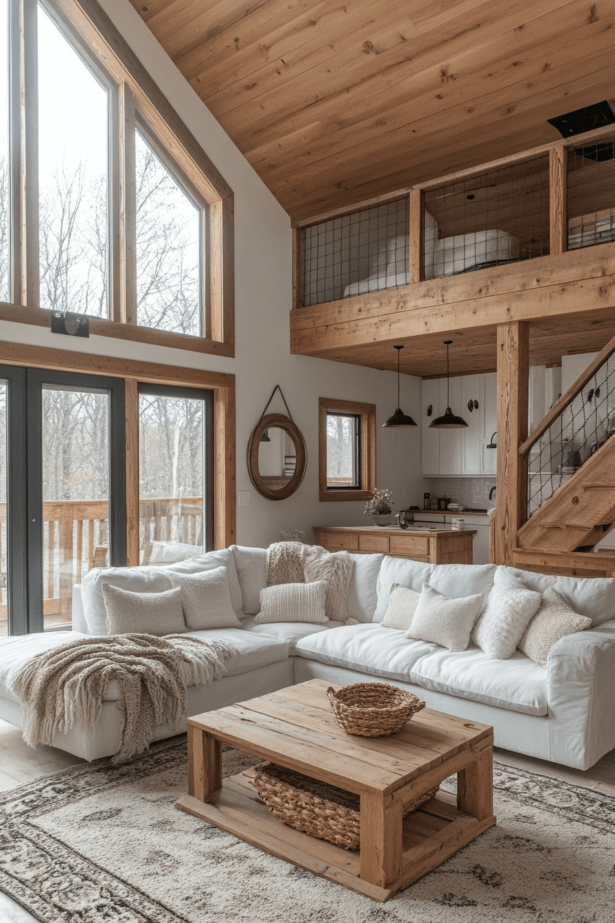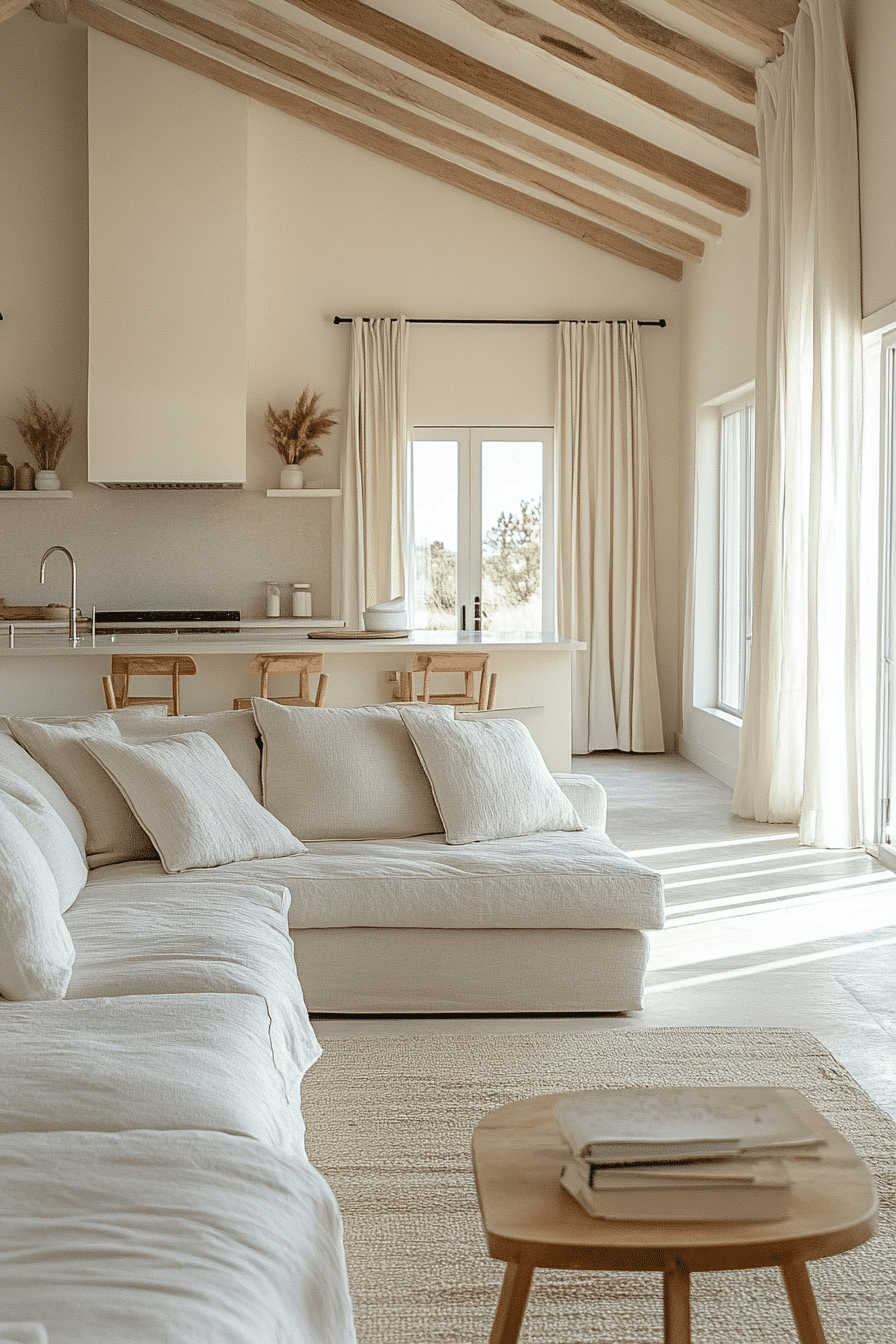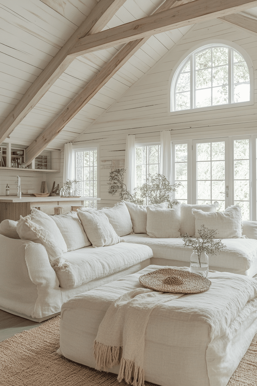 Layered neutrals create depth and softness while maintaining an airy and cohesive look. These small barndominium ideas combine whites, creams, and taupes through textures and finishes. Subtle variation prevents flatness. The design feels warm and balanced. Every detail contributes to comfort. Explore more layered small barndominium ideas for a rich, soft aesthetic.