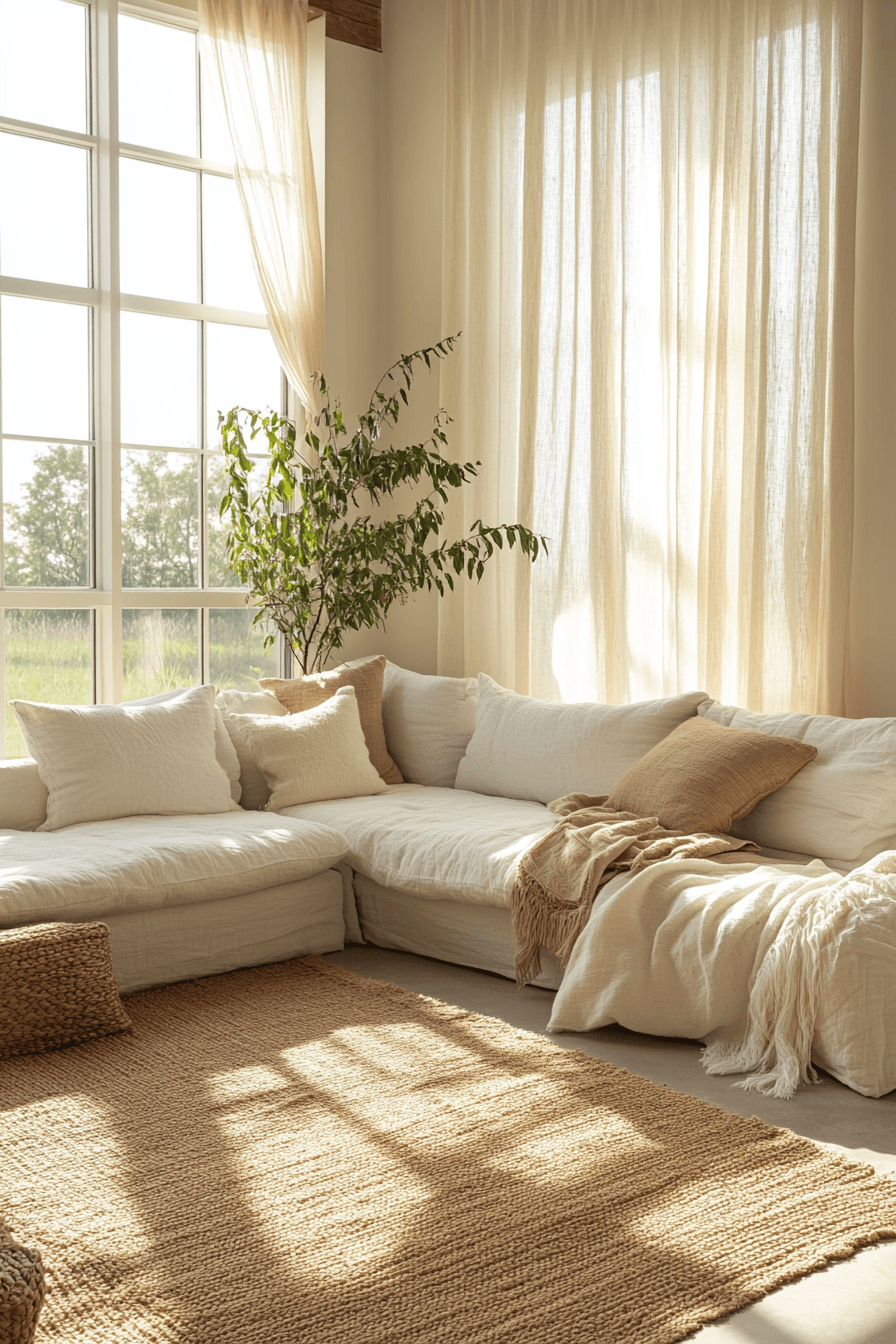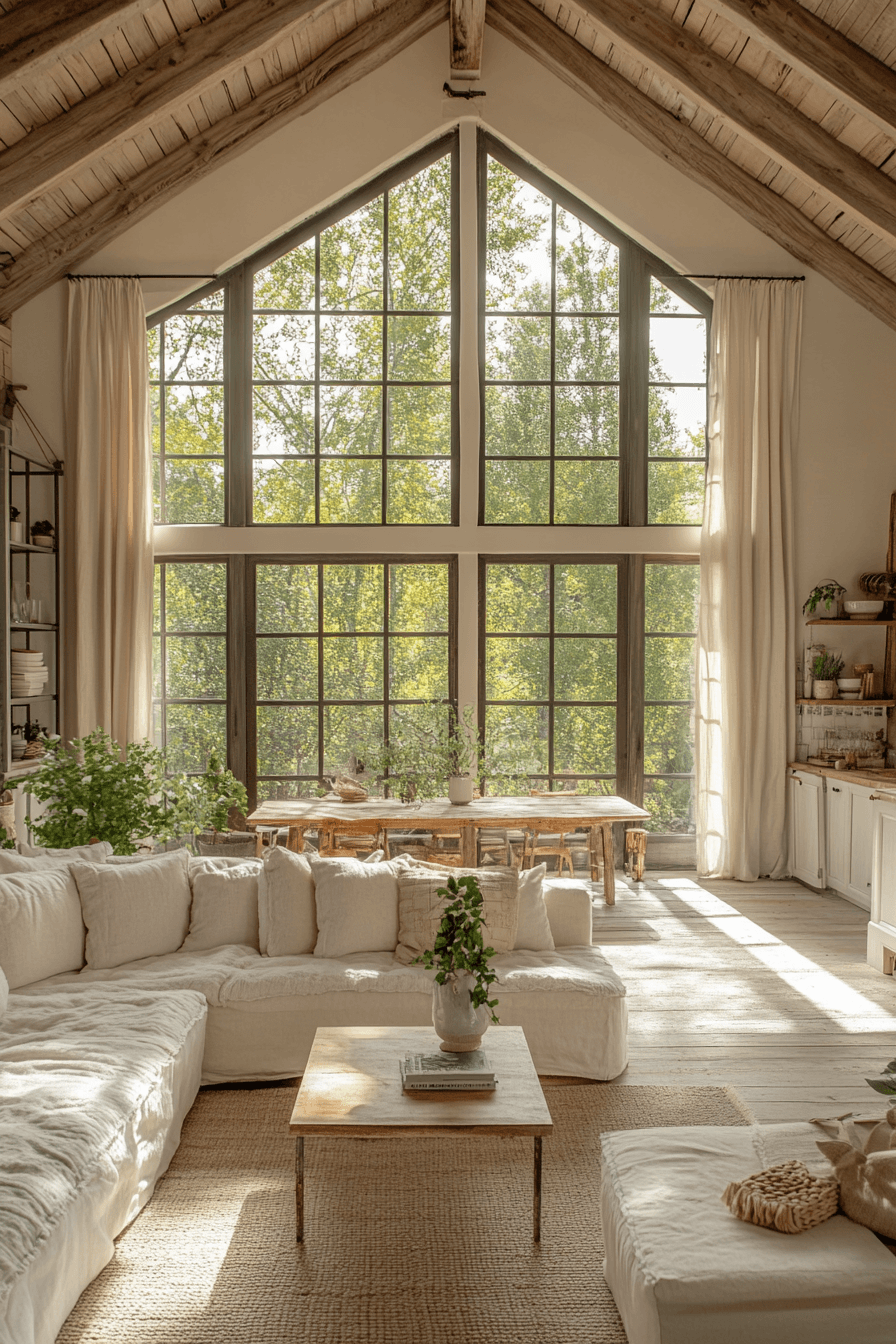 Natural light enhances the space, creating a bright and cheerful atmosphere that feels open and uplifting. These small barndominium ideas use pale tones and sheer fabrics to amplify light. Every surface reflects brightness. The design feels energizing yet calm. The space feels alive with light. Explore more sunlit small barndominium ideas for a radiant feel.