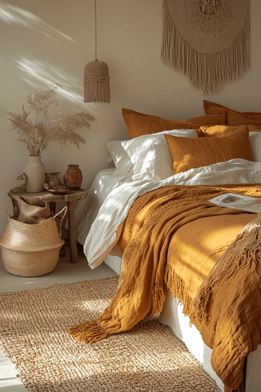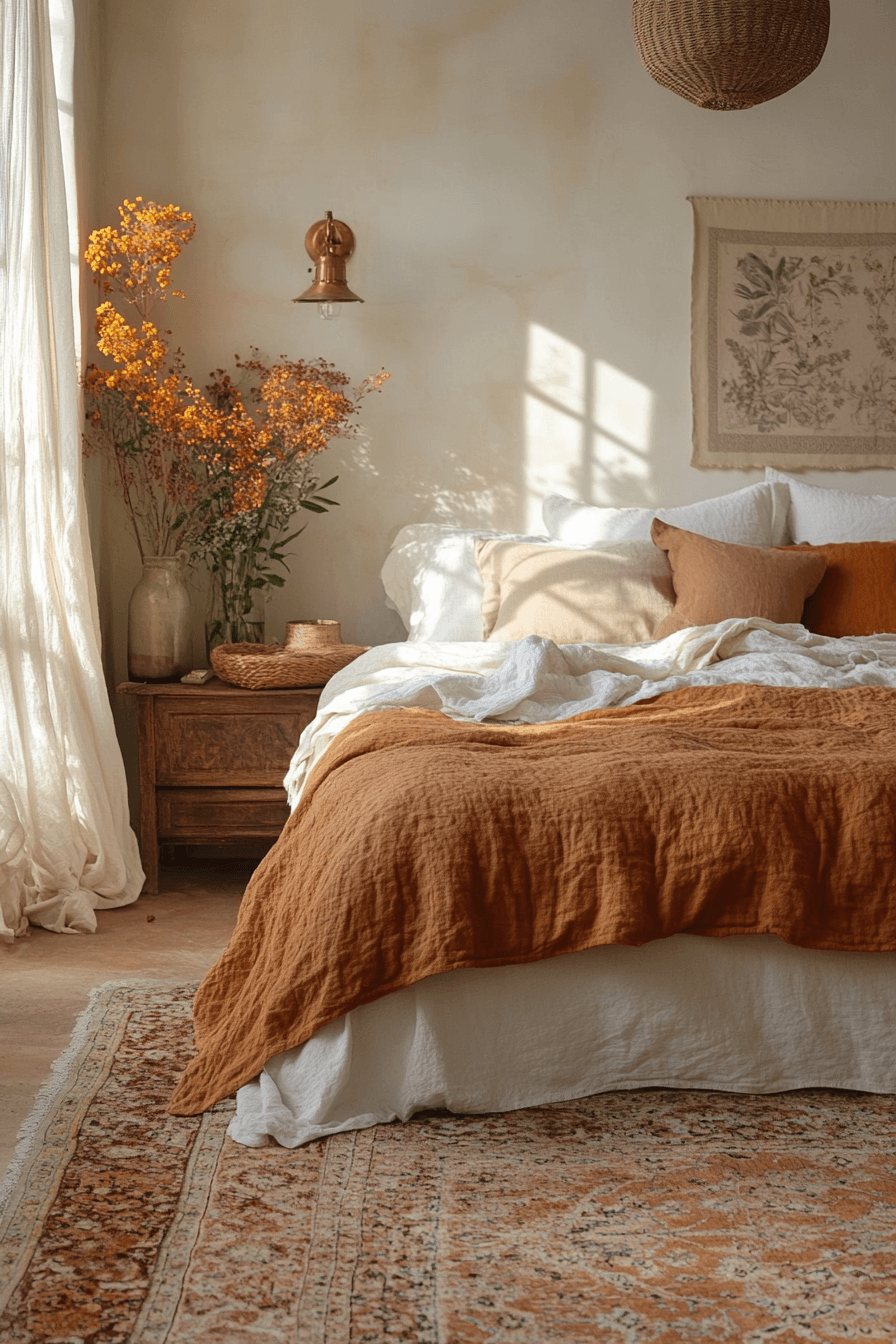 Caramel and clay tones blend smoothly in terracotta boho bedroom ideas designed for cozy comfort. Flowing linens and layered pillows create softness. Woven decor and amber lighting enhance the warm palette. The tone-on-tone design feels calming and stylish. The room invites restful evenings. Explore terracotta boho bedroom ideas inspired by caramel warmth.