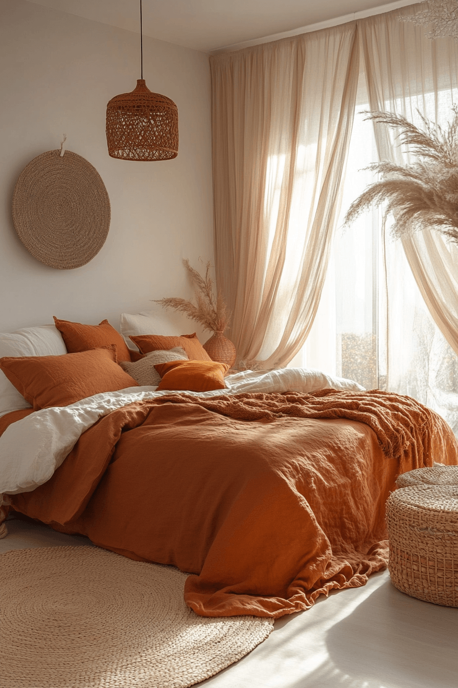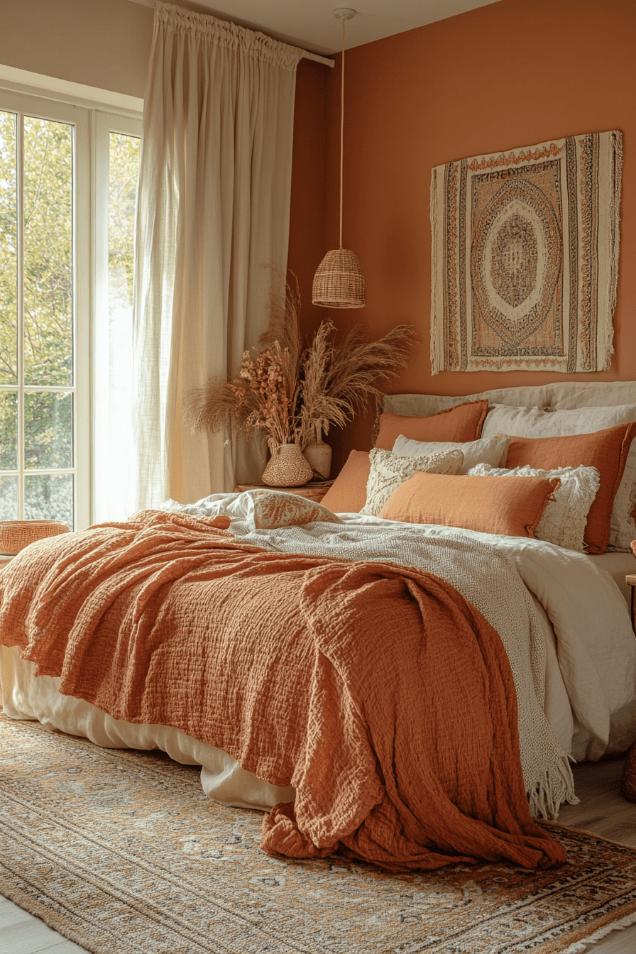 Cinnamon, clay, and caramel tones create welcoming terracotta boho bedroom ideas with layered warmth. Terracotta blankets paired with golden wood furniture build visual harmony. Woven baskets and textured pillows add depth. Soft greenery freshens the warm palette. The bedroom feels vibrant and balanced. Explore terracotta boho bedroom ideas styled with toasted tones.
