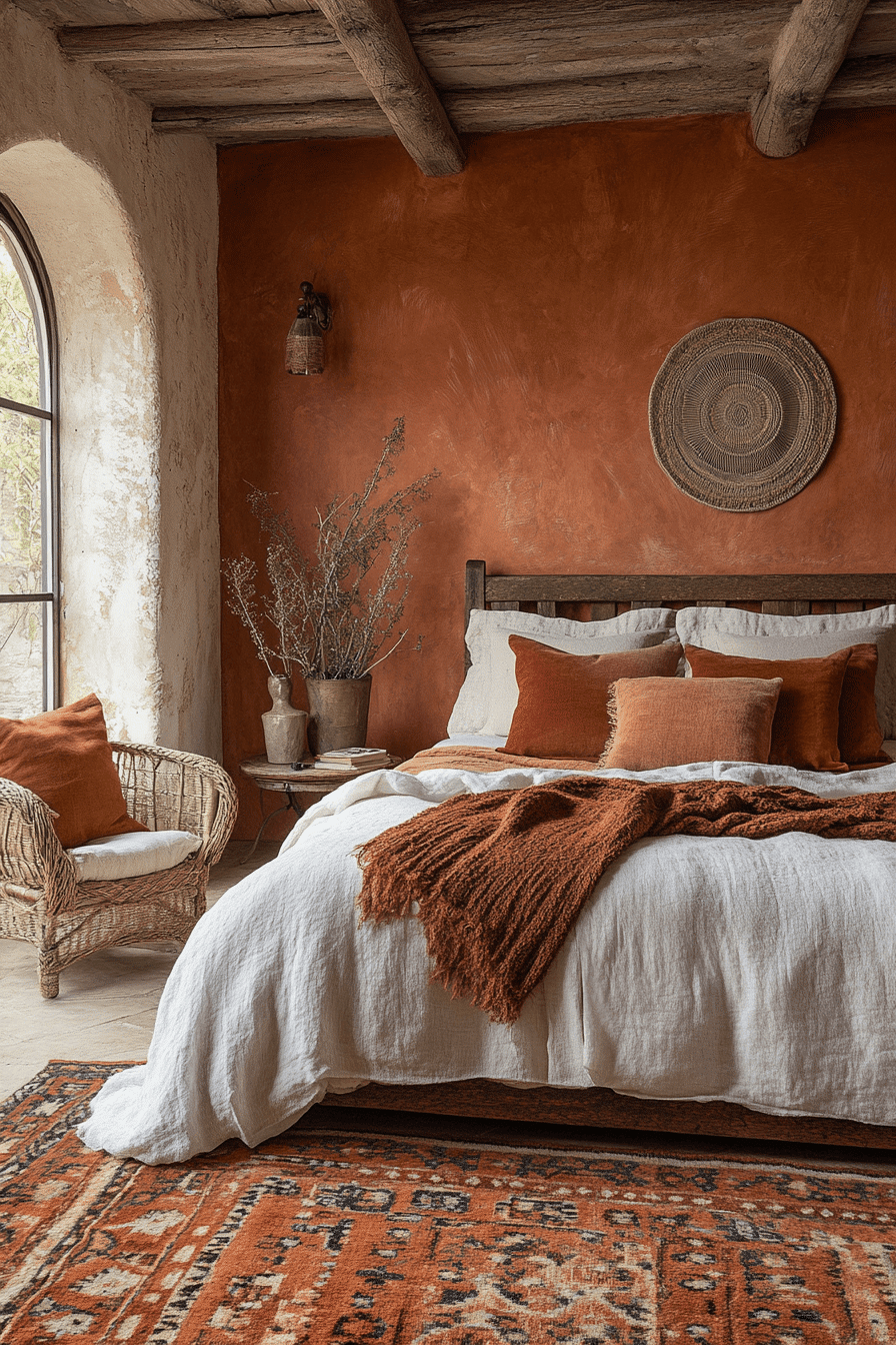 Rich clay walls create cozy cocoon-like terracotta boho bedroom ideas perfect for restful nights. Deep-toned linens and layered pillows enhance the intimate vibe. Vintage rugs and woven decor echo natural canyon textures. Low furniture keeps the layout relaxed and inviting. The result feels protective and comforting. Discover terracotta boho bedroom ideas inspired by canyon warmth.