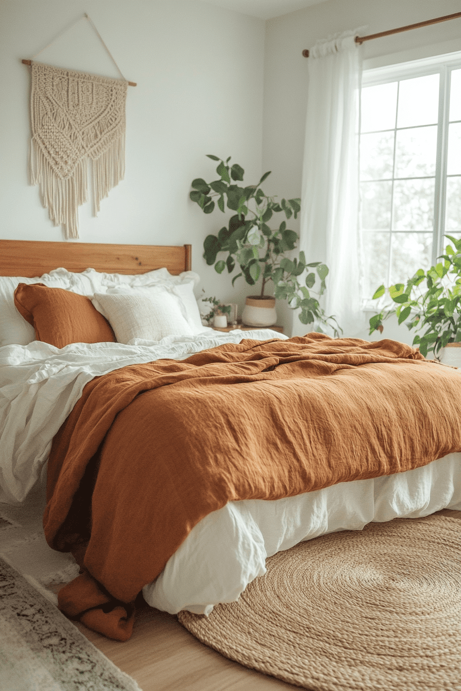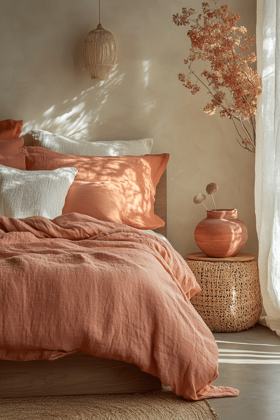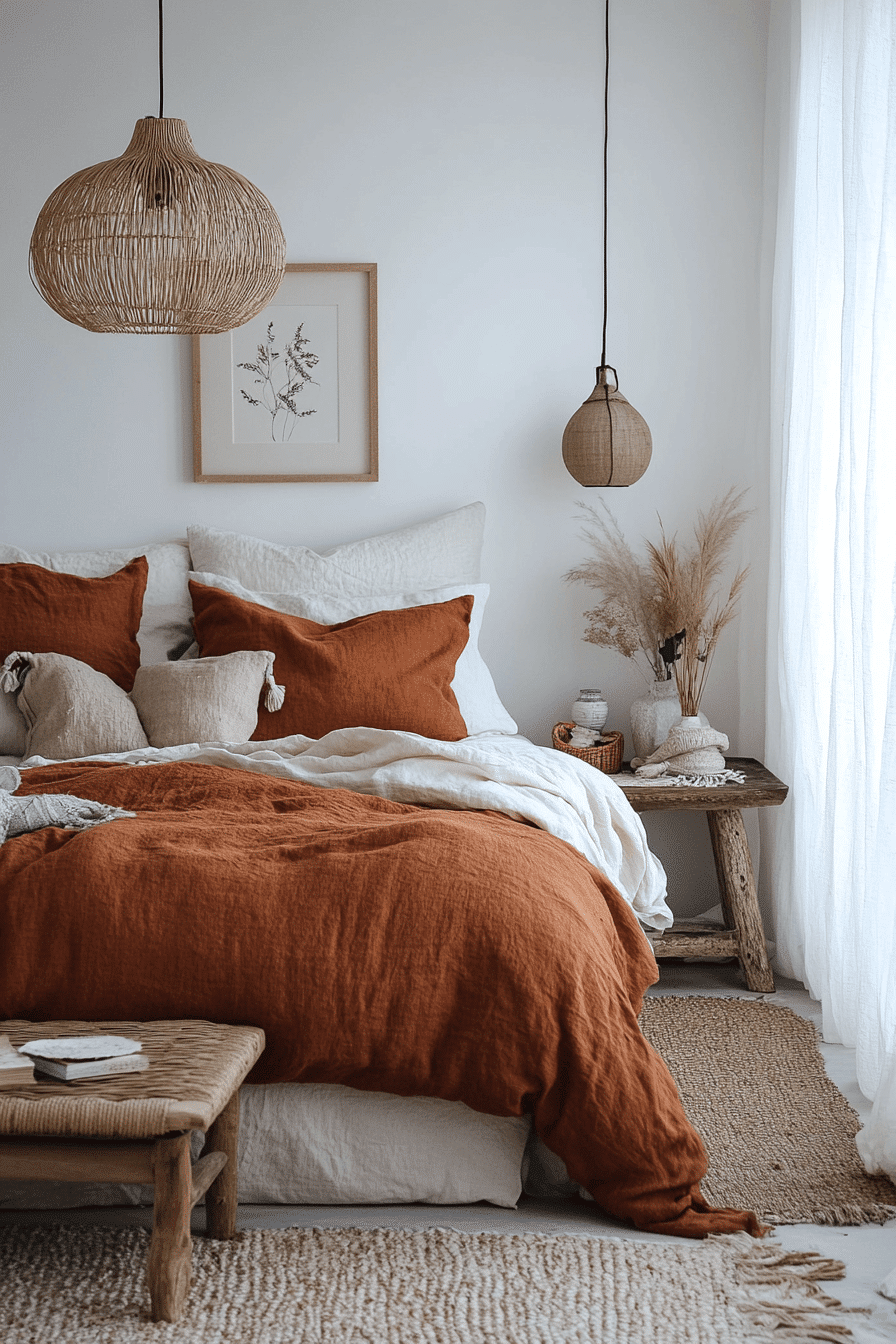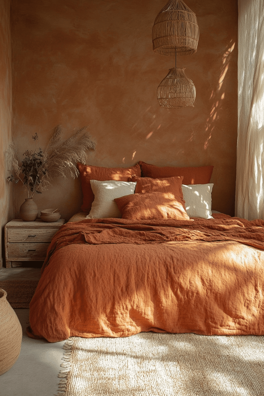 Rust-colored linen fabrics bring effortless charm to terracotta boho bedroom ideas. A clay-toned linen duvet anchors the palette beautifully. Light wood furniture and airy curtains soften the design. Jute rugs and dried florals enhance the earthy vibe. The space feels grounded yet breathable. Discover terracotta boho bedroom ideas that celebrate linen textures.