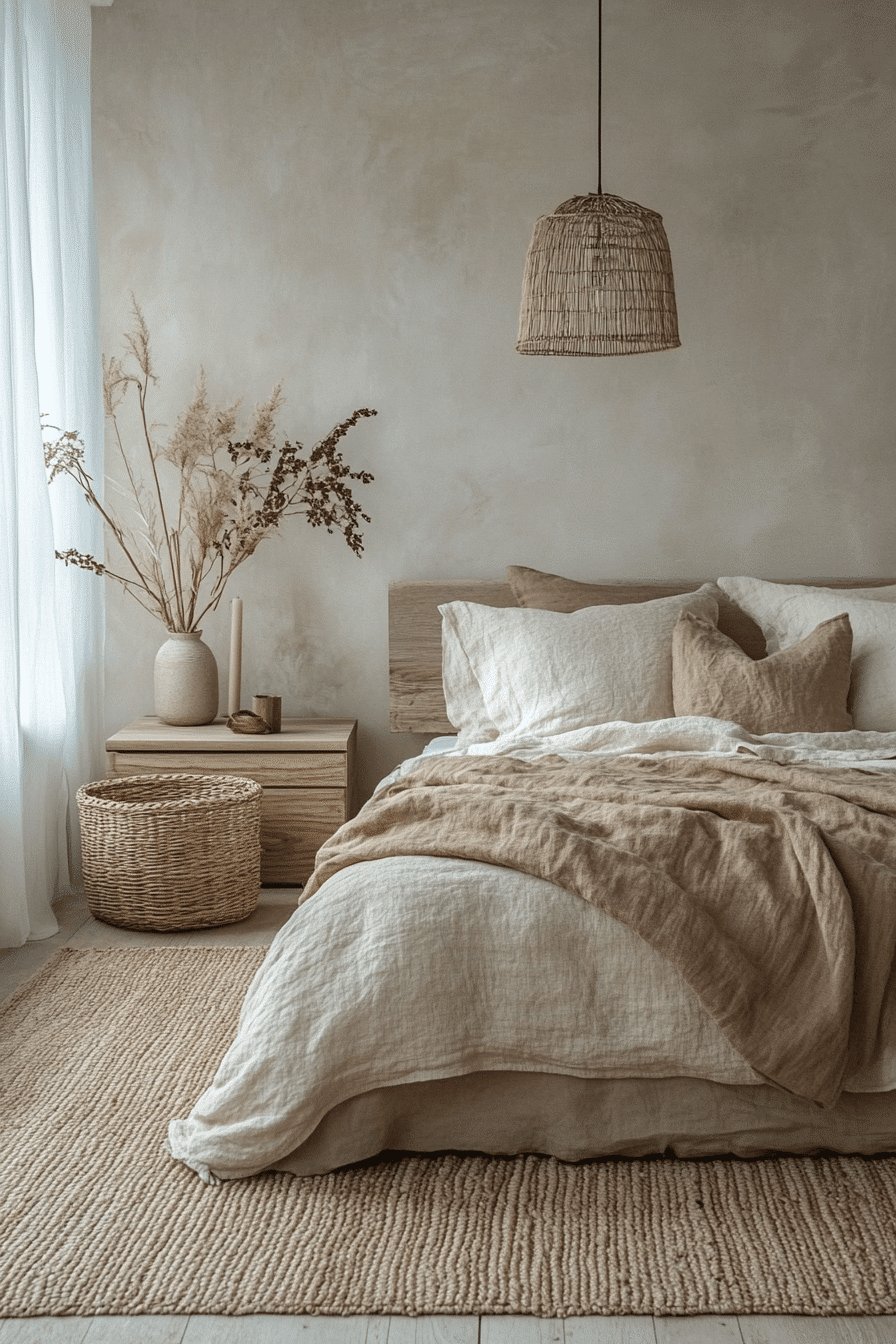 Natural materials shine in terracotta boho bedroom ideas that highlight sun-warmed textures. Linen bedding, clay-toned blankets, and textured wall decor create visual interest. Matte ceramic pieces pair beautifully with rattan lighting. The warm color palette radiates cozy comfort throughout the room. Minimal artwork keeps the design modern and balanced. See more terracotta boho bedroom ideas celebrating natural textures.