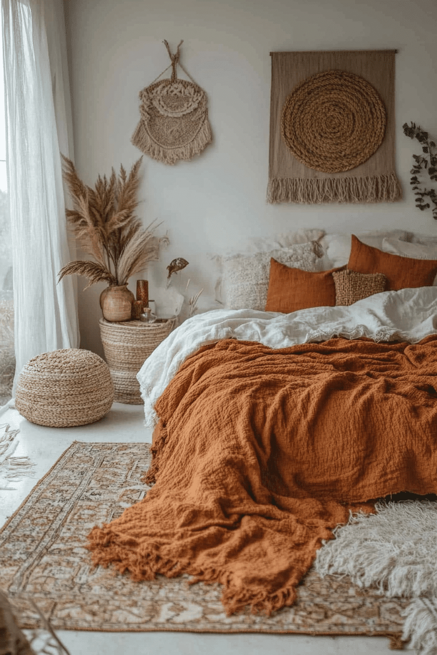 Playful fringe and tassel details add charm to terracotta boho bedroom ideas. Rust and cream bedding paired with textured pillows create cozy layers. A woven rug and beaded lighting enhance the tactile appeal. Terracotta walls or blankets ground the palette beautifully. The room feels lively yet comfortable. Explore terracotta boho bedroom ideas with fringe-filled personality.