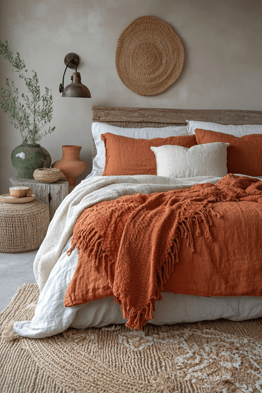 Rust-colored fabrics and nubby textiles create tactile terracotta boho bedroom ideas full of depth. Jute rugs and embroidered pillows add natural texture. Reclaimed wood furniture reinforces the rustic aesthetic. Clay pottery completes the earthy palette. The room feels richly layered and inviting. Explore terracotta boho bedroom ideas designed around texture.