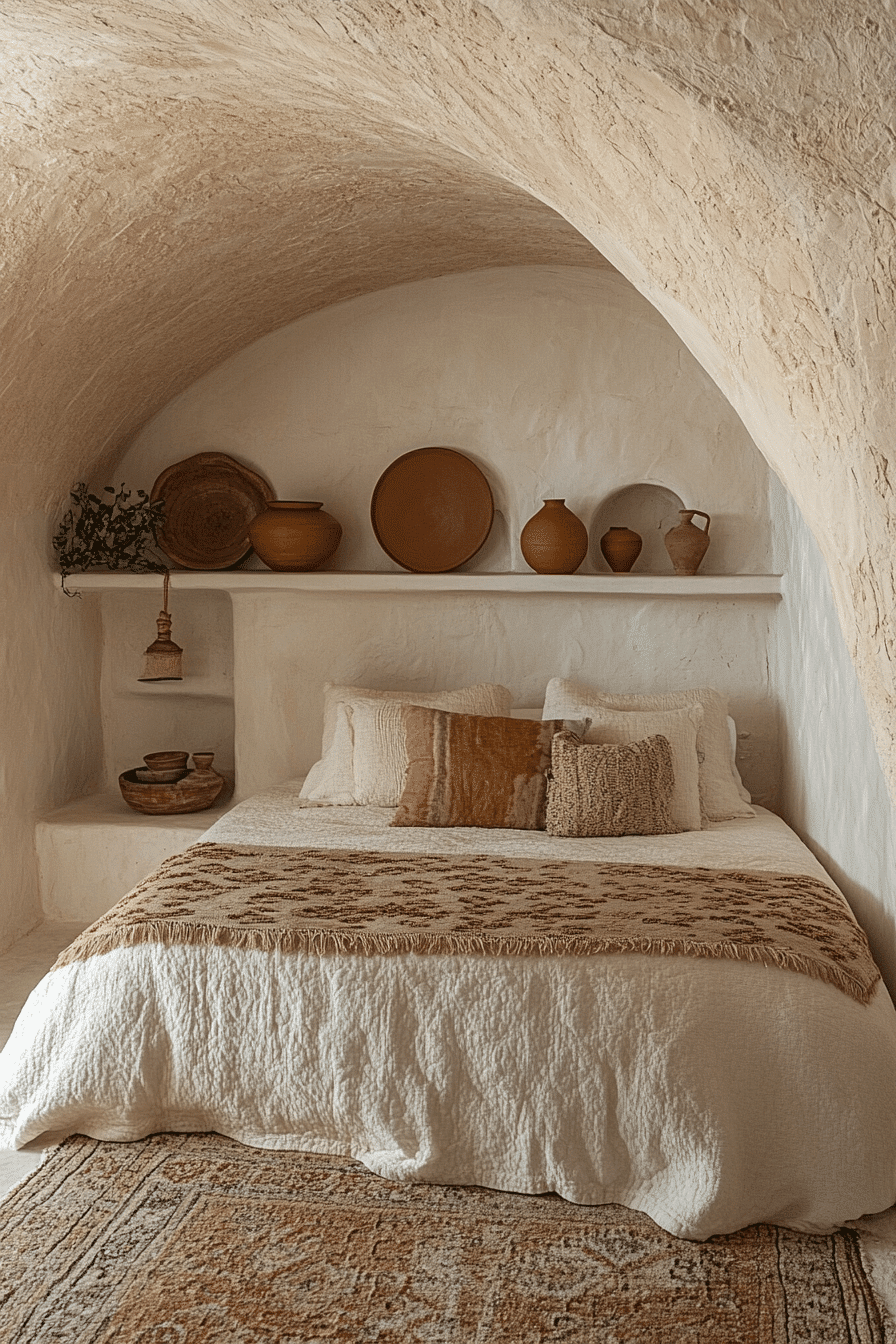 Southwestern influences shape terracotta boho bedroom ideas with earthy character. Clay walls, arched mirrors, and pottery accents create a desert retreat vibe. Cream furniture keeps the palette balanced. Woven textiles enhance the bohemian feel. The space feels grounded and breezy. Discover terracotta boho bedroom ideas inspired by adobe style.
