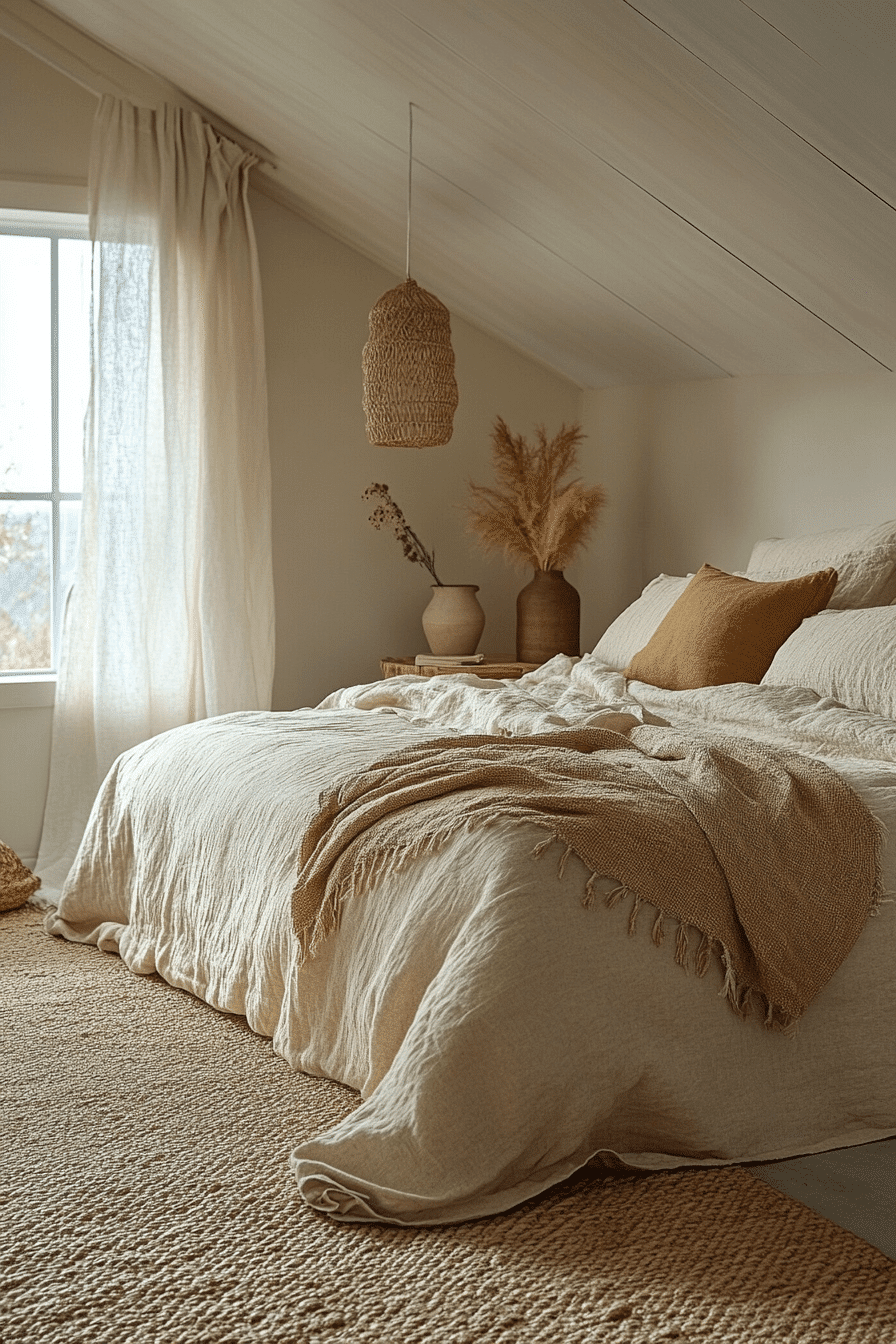 Warm clay tones create a dreamy desert-inspired mood in terracotta boho bedroom ideas. Layer earthy terracotta shades with woven rugs and rattan accents to build texture. White linen bedding keeps the palette light and breathable while highlighting the rich clay colors. Ceramic decor and pampas grass add organic movement to the room. The natural warmth of terracotta makes the space feel grounded yet modern. Discover more terracotta boho bedroom ideas that bring desert warmth indoors.
