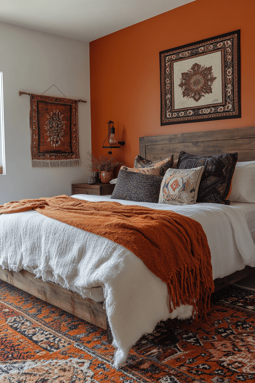 Deep terracotta tones paired with burnt orange and warm brown create bold terracotta boho bedroom ideas. Chunky knit throws and rustic wood decor amplify the earthy feel. Dried botanicals and tribal patterns introduce authentic boho texture. The palette feels vibrant yet grounded. The room becomes both cozy and expressive. Explore terracotta boho bedroom ideas filled with earthy richness.