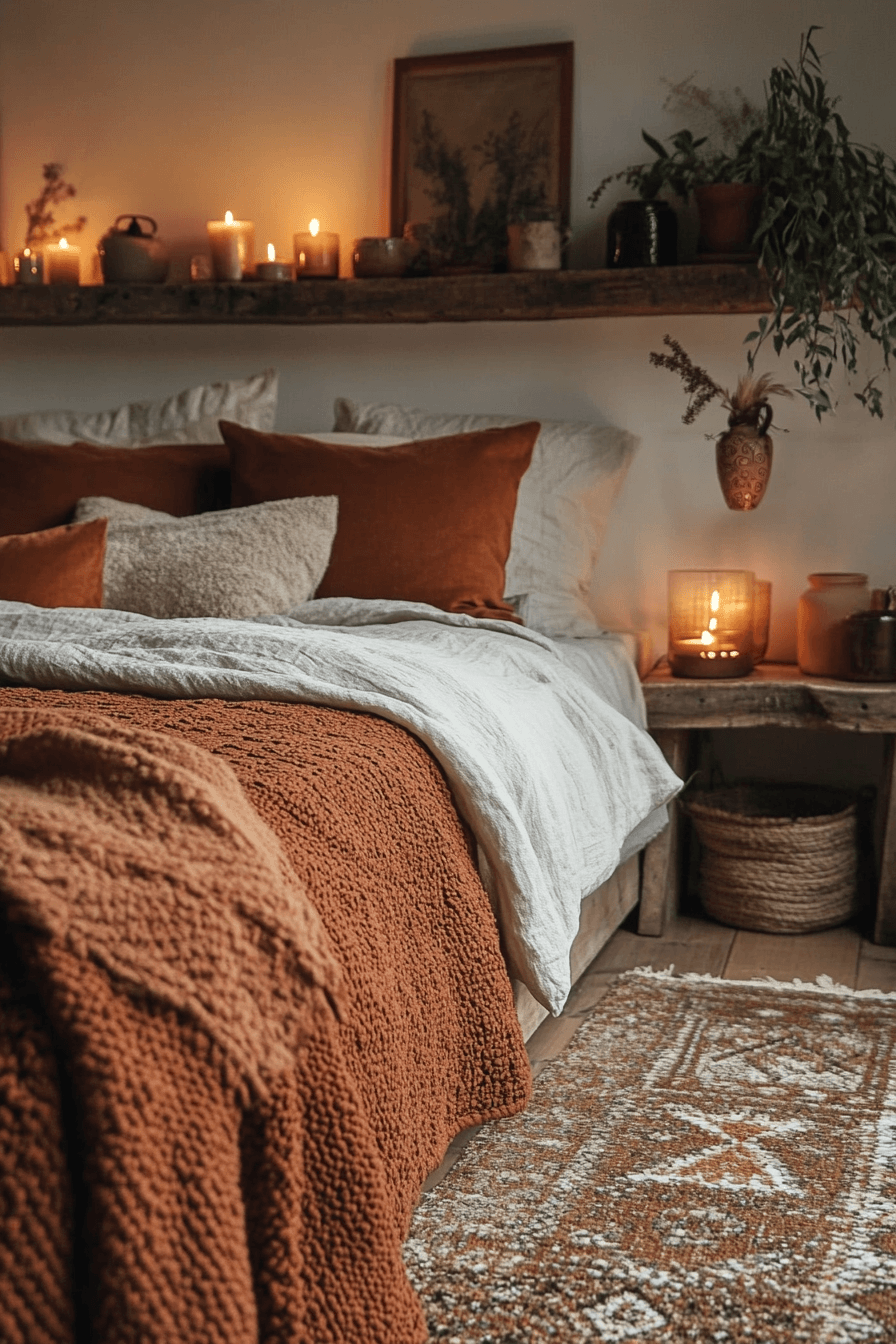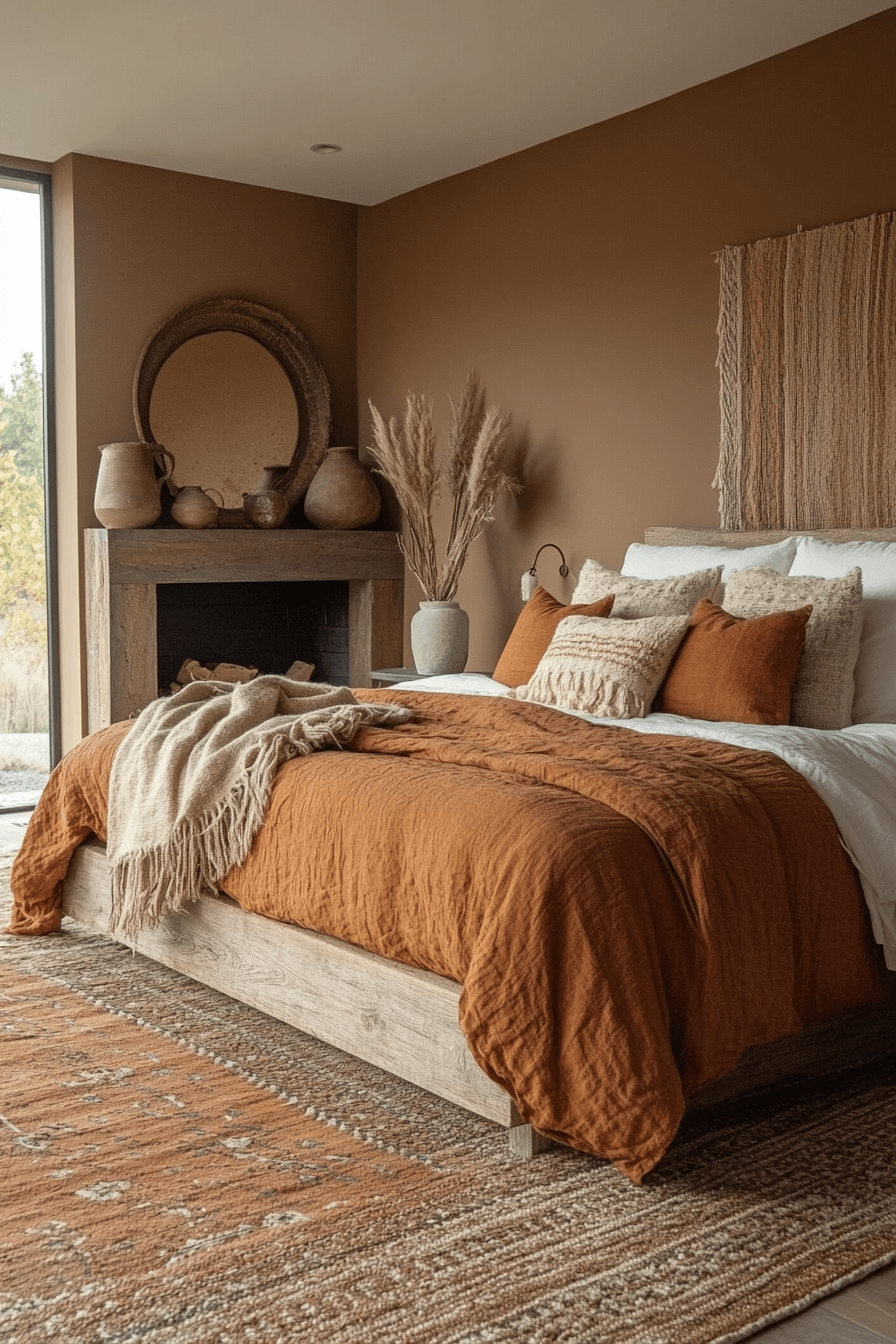 Deep clay and cinnamon tones create welcoming terracotta boho bedroom ideas inspired by fireplace warmth. Soft throws, candlelight, and aged wood build a cozy atmosphere. Stone accents and vintage decor enhance the rustic look. The palette feels rich and comforting. The room becomes a warm retreat year-round. Explore terracotta boho bedroom ideas inspired by hearth warmth.
