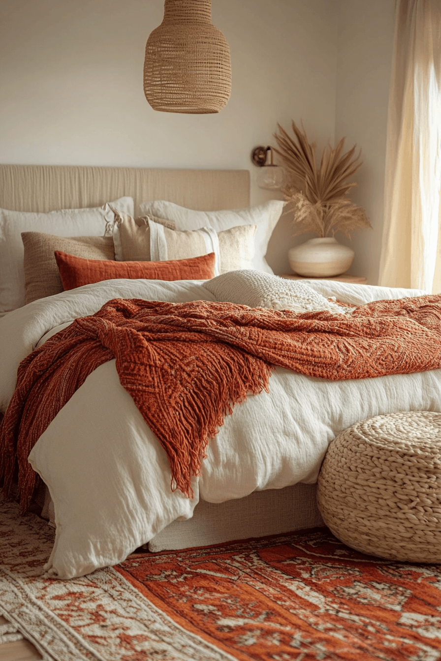 Strong clay tones can feel beautifully balanced in terracotta boho bedroom ideas when softened with plush textures. Rust bedding paired with ivory pillows creates gentle contrast. Boucle chairs and woven accents introduce softness. Minimal artwork and handwoven rugs complete the relaxed look. The design feels modern yet cozy. See terracotta boho bedroom ideas that blend bold color with soft comfort.