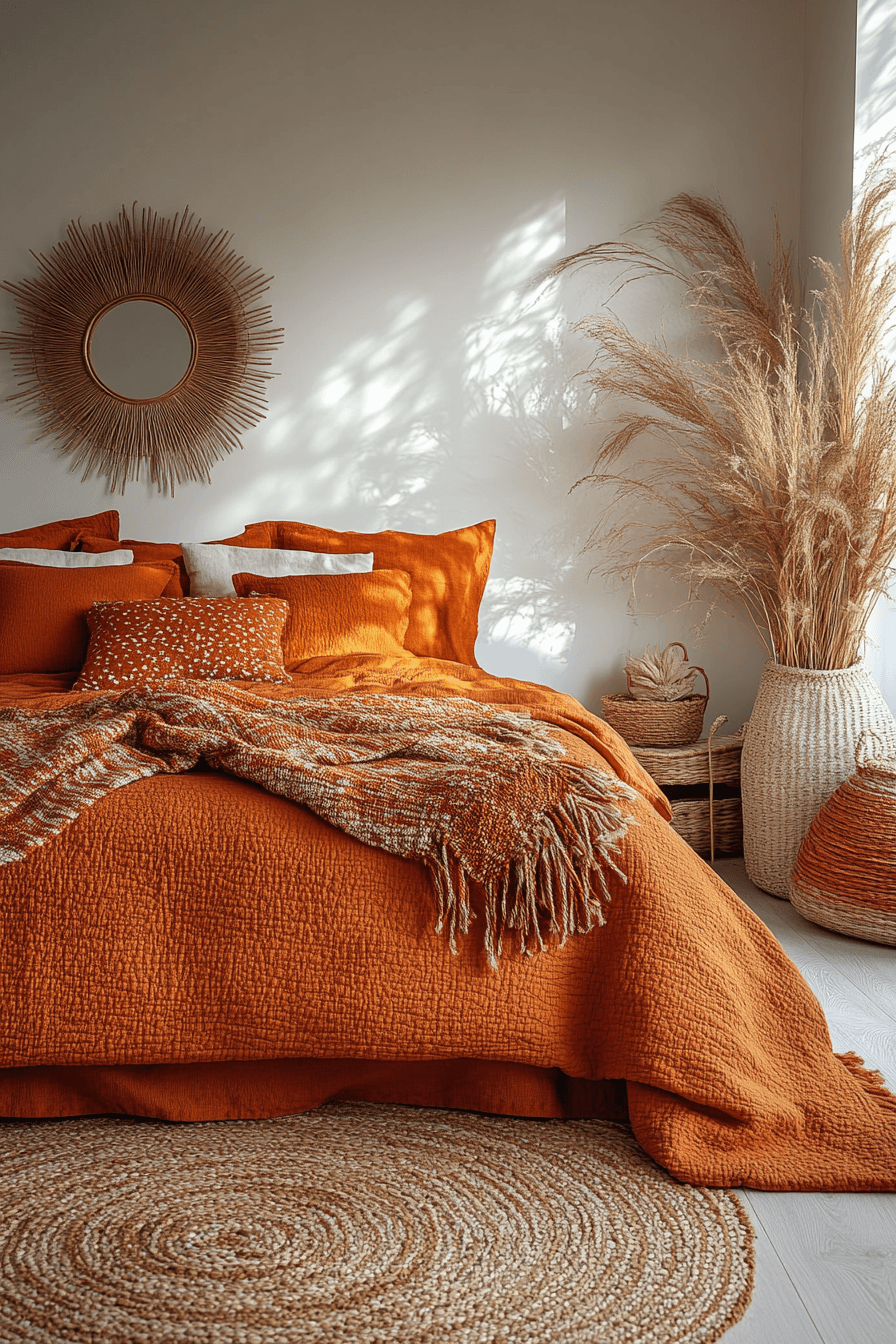 Gradient rust and peach tones add fluid color movement to terracotta boho bedroom ideas. Ombré textiles and layered throws create gentle transitions across the palette. Whitewashed furniture keeps the room bright and balanced. Curved decor pieces add modern bohemian flair. The space feels warm and organic. Browse terracotta boho bedroom ideas that highlight flowing color palettes.