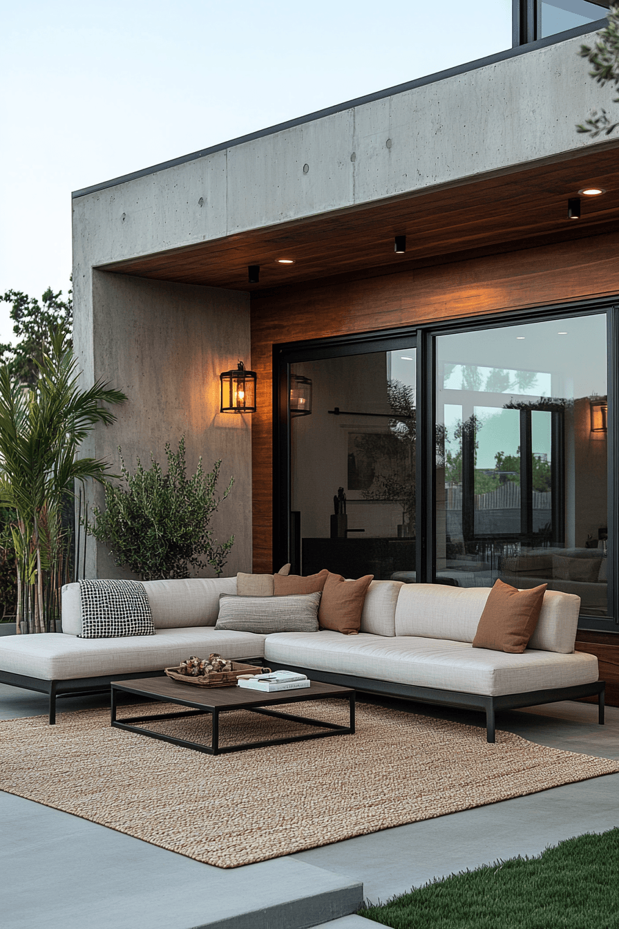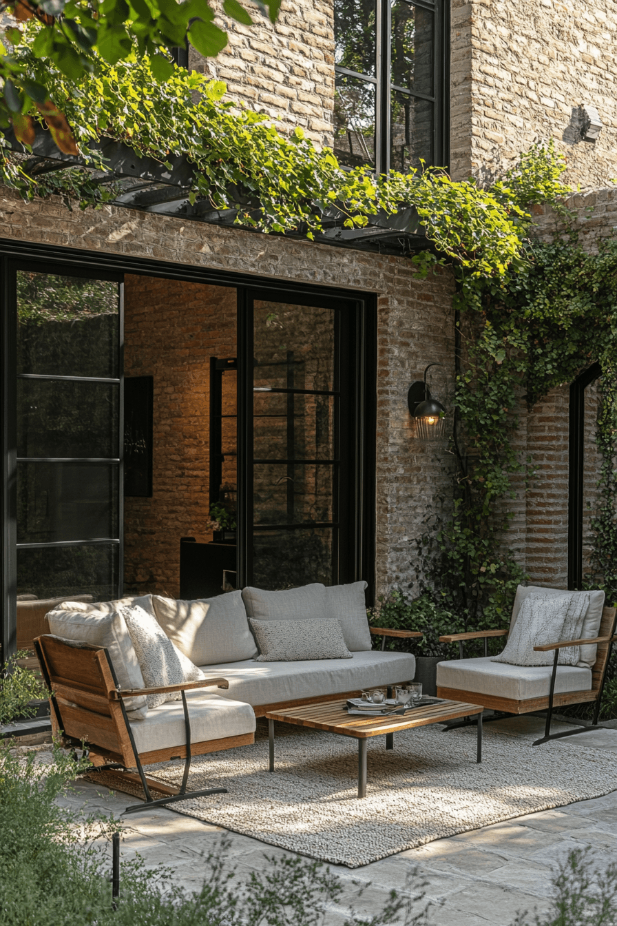 Clean geometry defines these tiny patio ideas with sleek lines and modern appeal. Straight-edged furniture creates structure and flow. Neutral tones highlight the simplicity of the design. Soft textiles balance the sharp lines. The patio feels contemporary and refined. Discover more tiny patio ideas with modern design.