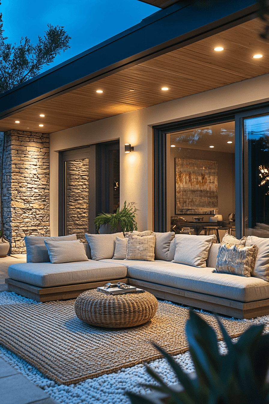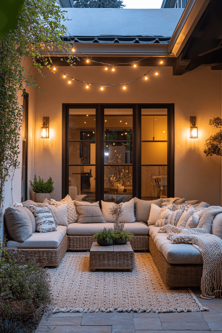 Relaxation takes center stage in these tiny patio ideas with cozy seating and calming palettes. Soft fabrics and layered cushions enhance comfort. Neutral flooring improves flow. Lighting highlights inviting details. The patio feels perfect for unwinding. Explore more tiny patio ideas designed for relaxation.