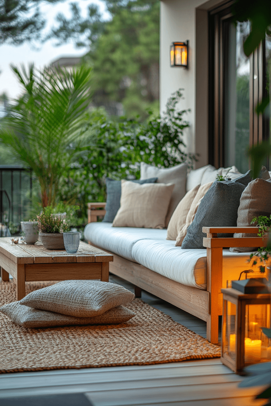 Elevated details define these tiny patio ideas, showing how small spaces can still feel refined and elegant. Neutral tones paired with sleek furniture create a timeless look. Layered textiles add depth and subtle sophistication. Lighting elements like lanterns complete the upscale ambiance. The overall design feels polished and inviting. Explore more tiny patio ideas that highlight elegance.