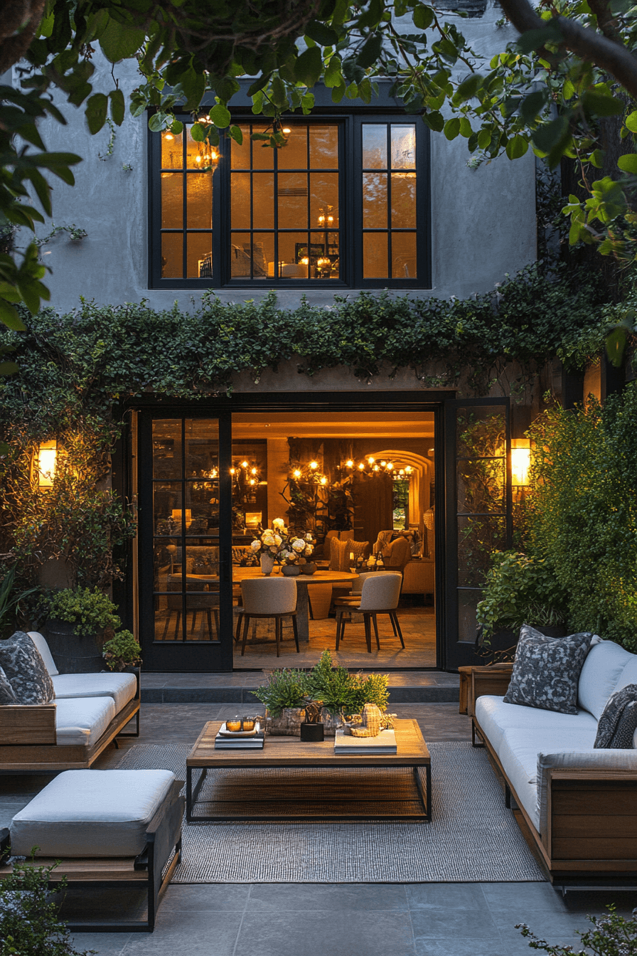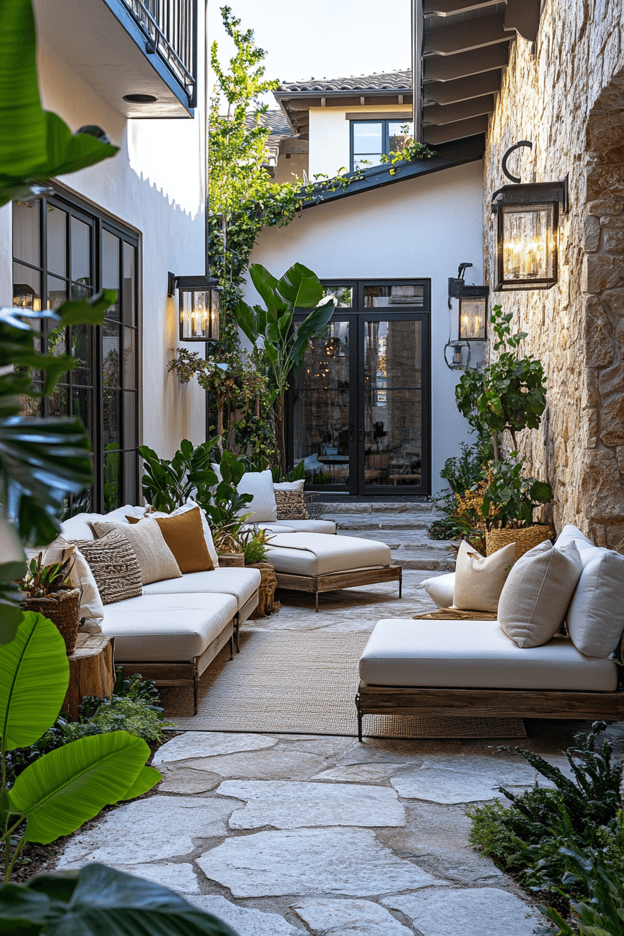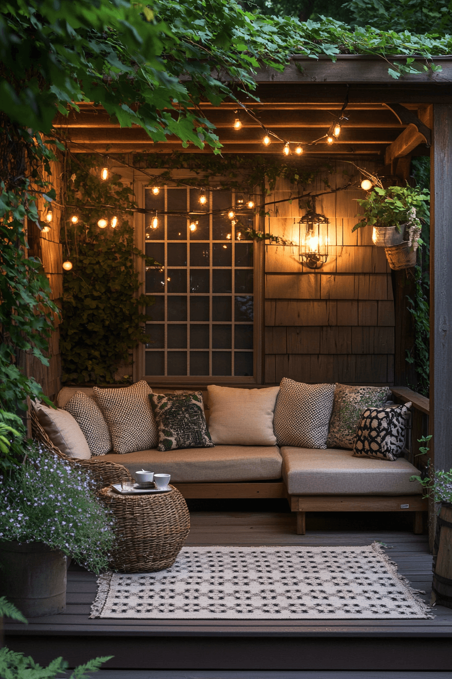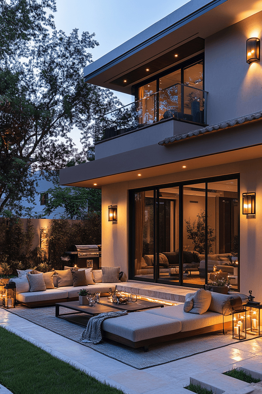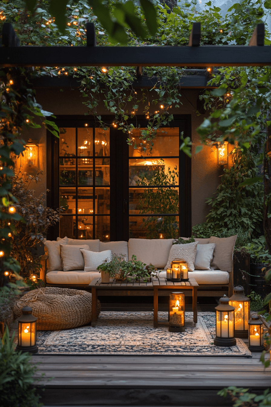Lighting transforms these tiny patio ideas into cozy evening retreats. Lanterns and subtle lighting fixtures create a warm glow. Neutral seating enhances comfort and cohesion. Reflective elements amplify brightness and elegance. The patio feels inviting after sunset. Explore more tiny patio ideas that highlight lighting.
