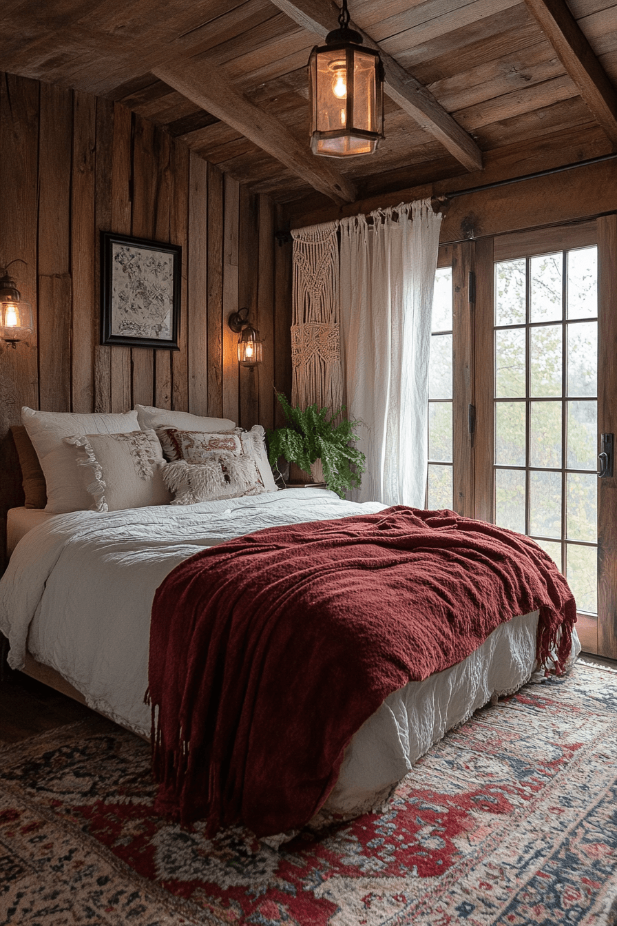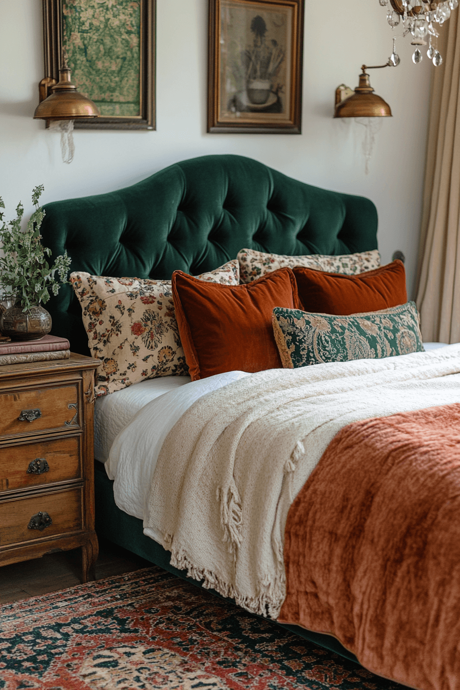 Velvet textures paired with rustic materials create inviting vintage boho bedroom ideas. A velvet headboard combined with linen throws adds depth and softness. Reclaimed wood nightstands enhance the rustic charm. Hand-carved decor and woven accents complete the look. The room feels cozy yet sophisticated. Browse vintage boho bedroom ideas that mix velvet and rustic style.