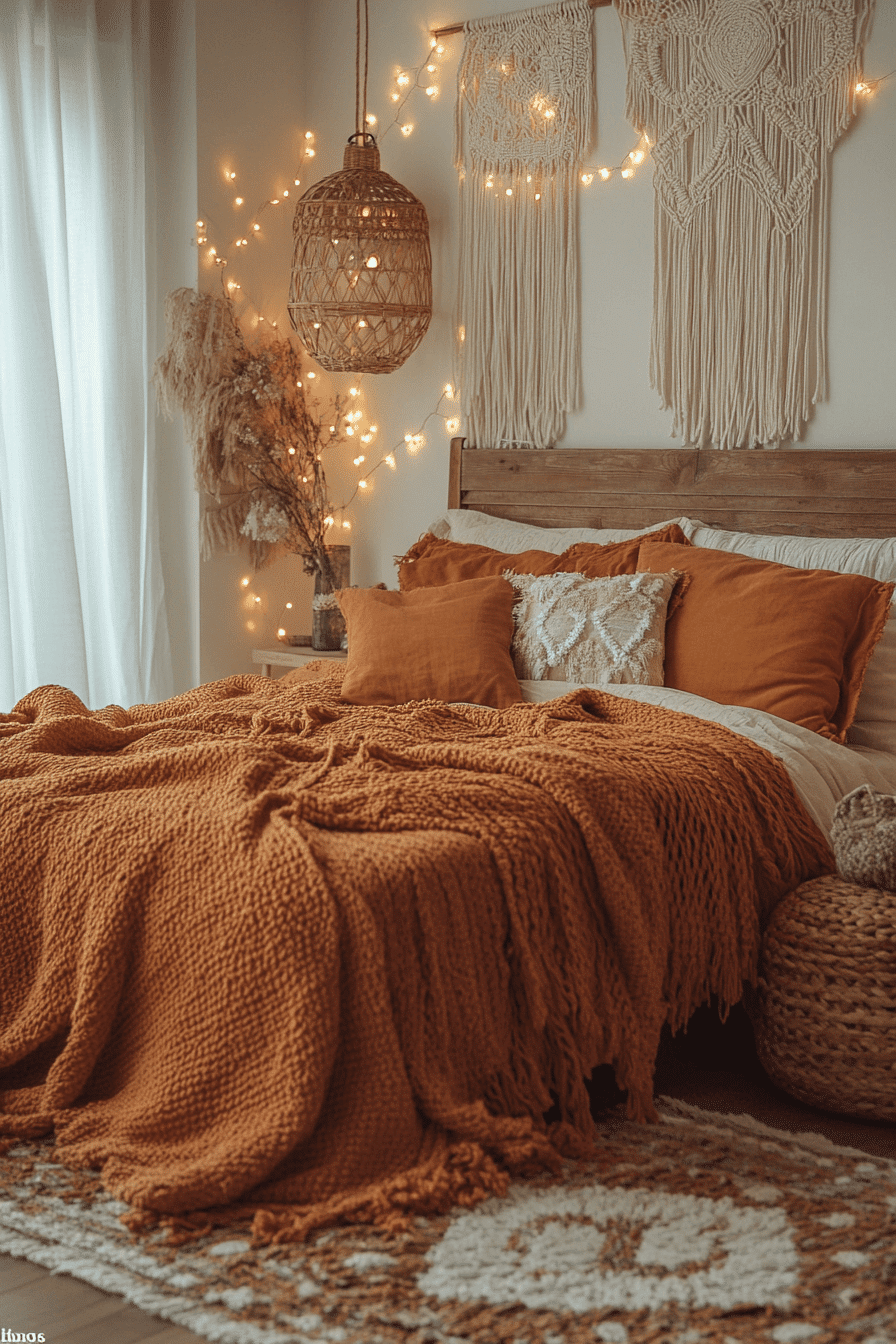 Golden accents and macramé textures can brighten vintage boho bedroom ideas. Amber glass lighting and intricate knot patterns add warmth and detail. Natural wood furniture balances the golden tones. Bronze or brass decor enhances the vintage feel. The room glows with inviting charm. Explore vintage boho bedroom ideas with amber macramé inspiration.
