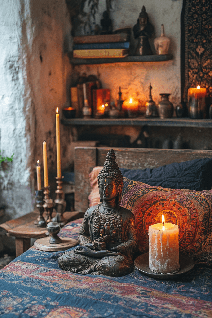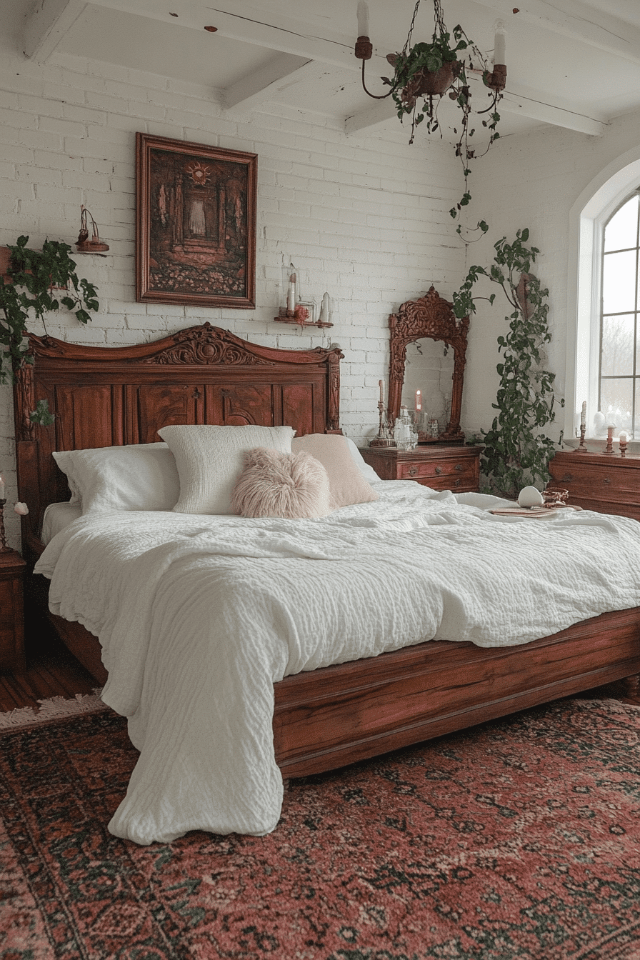 Spiritual decor and antique finds add depth to vintage boho bedroom ideas with soulful style. Beaded curtains, vintage statues, and layered textiles create a meaningful environment. Mismatched frames and thrifted lamps add eclectic personality. Candles and incense introduce sensory warmth. The space feels artistic and serene. Discover vintage boho bedroom ideas inspired by spiritual relics.