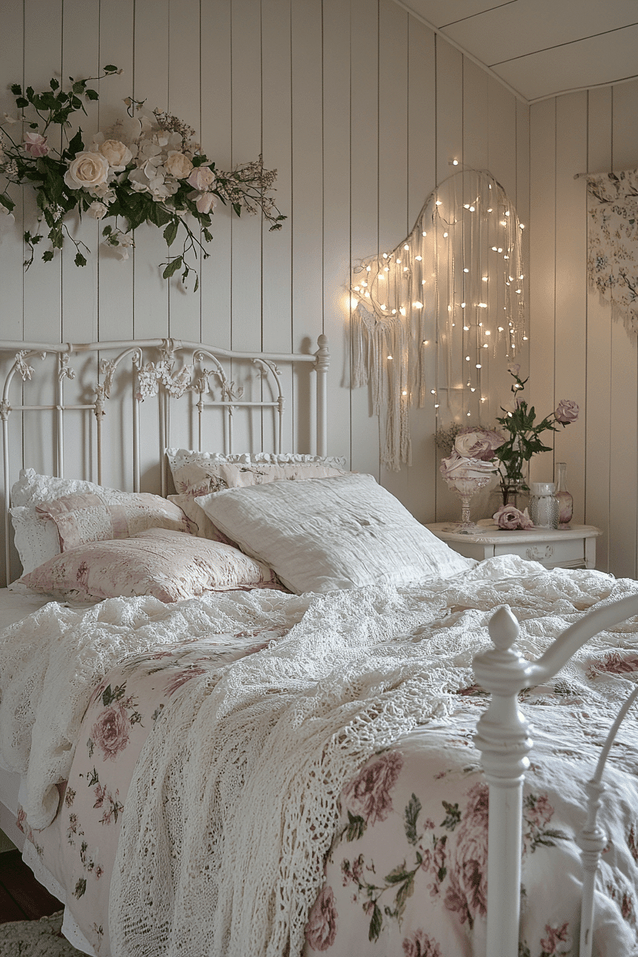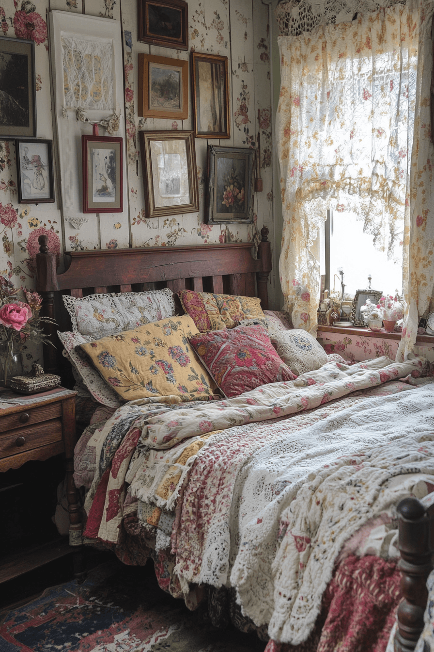 Soft lace textures add delicate beauty to vintage boho bedroom ideas. Lace curtains, doilies, and antique linens introduce gentle elegance. Whitewashed furniture keeps the palette light and airy. Travel-inspired decor like old maps or postcards adds personality. The room feels romantic and nostalgic. Explore vintage boho bedroom ideas filled with lace-inspired charm.